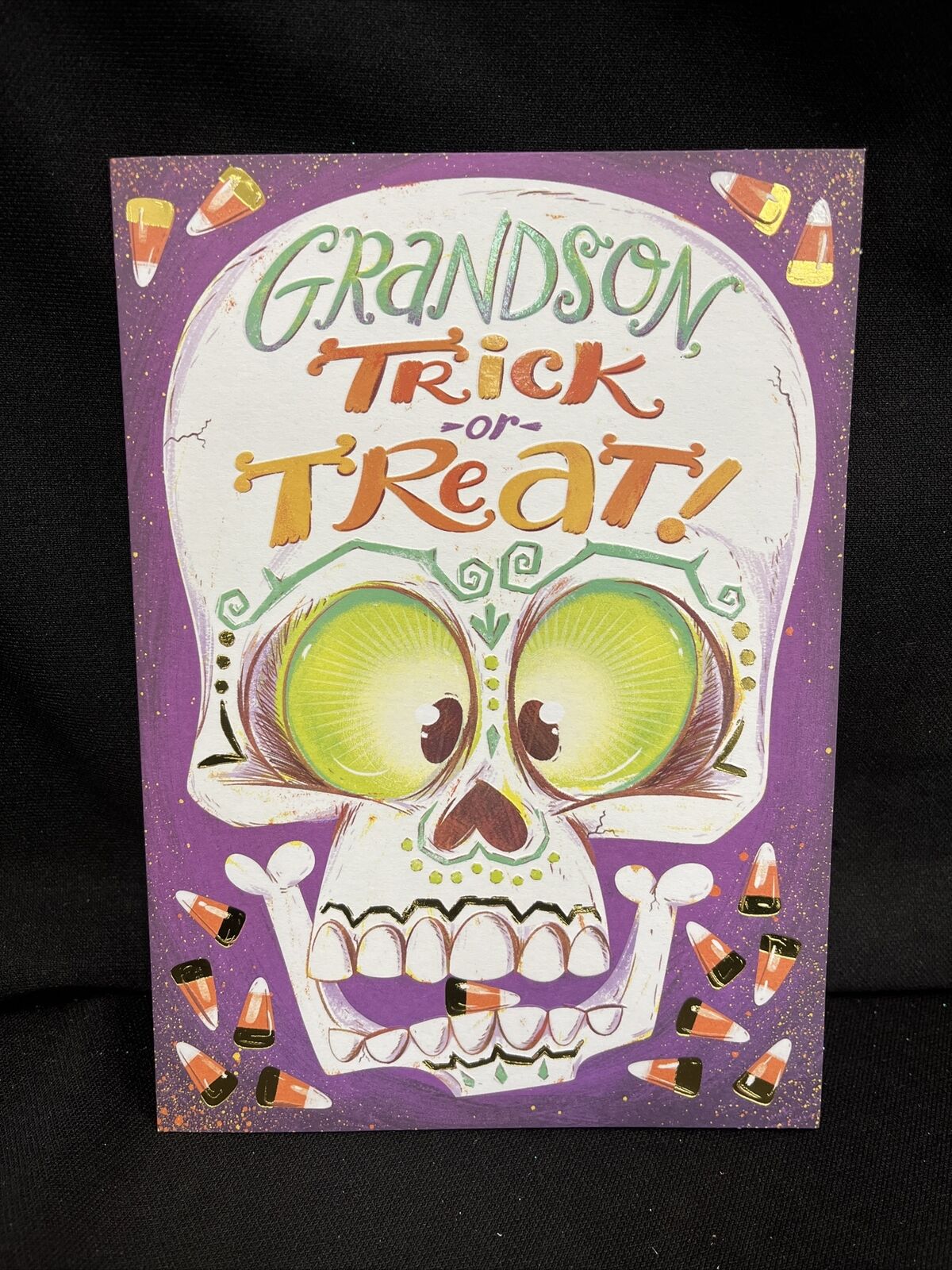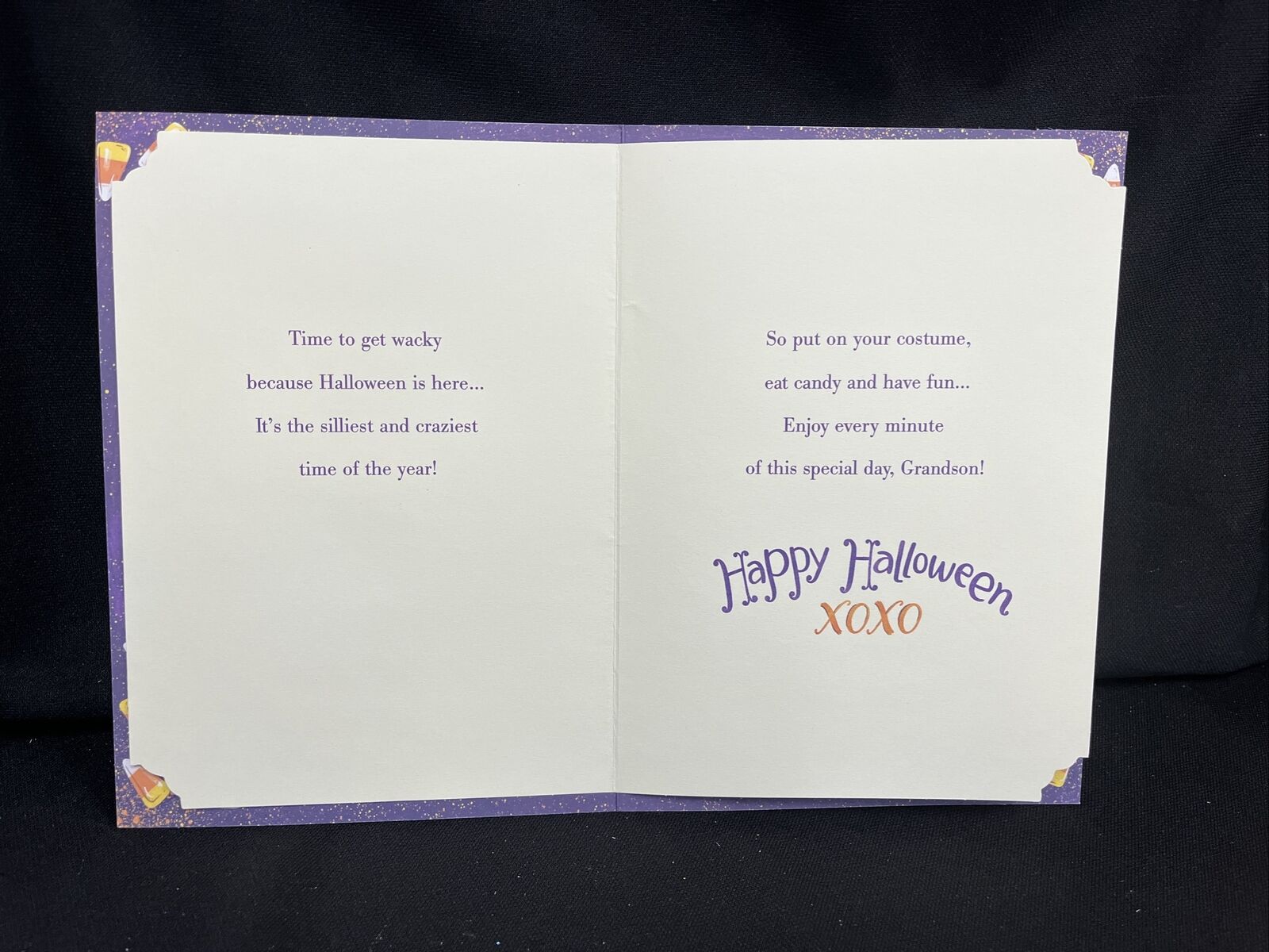Get ready to celebrate Halloween with this delightful grandson greeting card from Designer Greetings. The card is perfect for any Halloween occasion and comes with an envelope included.