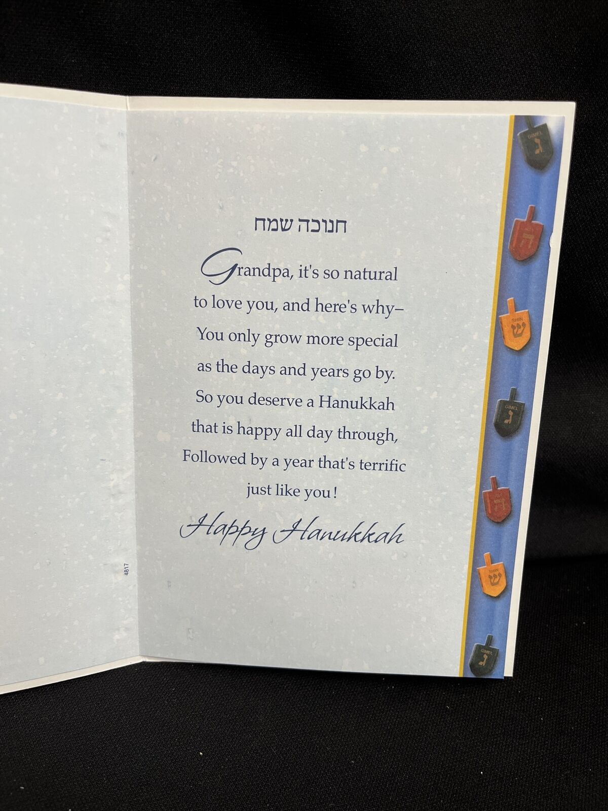 This Hanukkah greeting card is the perfect way to show your grandpa how much you care. Designed by Designer Greetings, this card is crafted with precision to ensure the highest quality. The card features a warm and heartfelt message that will brighten up any room. Whether you're sending the card to your grandpa's home or office, this card is sure to bring a smile to his face. The card is ideal for any Hanukkah occasion and is perfect for expressing your feelings in a unique and meaningful way. So why wait? Order now and send your grandpa the perfect Hanukkah greeting card!