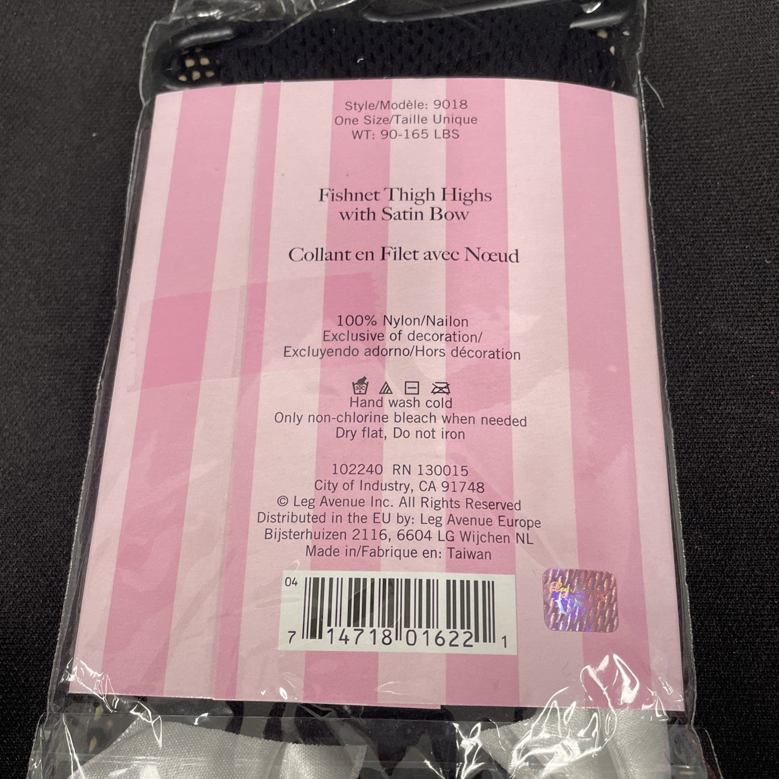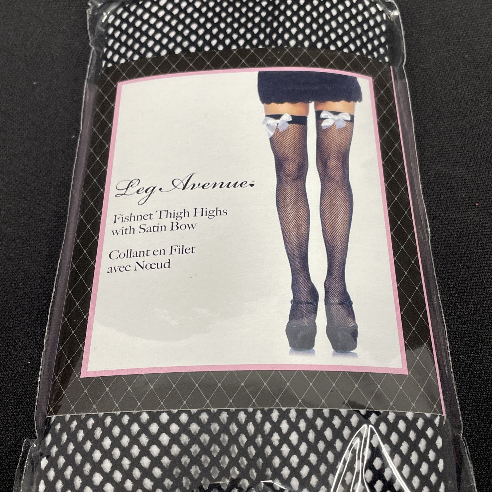 The product is a pair of white bow black fishnet thigh-highs with a net pattern, made of nylon. It is a one size fits all product from the brand Leg Avenue, designed for leisure occasions. The stocking does not have compression and is hand wash only.