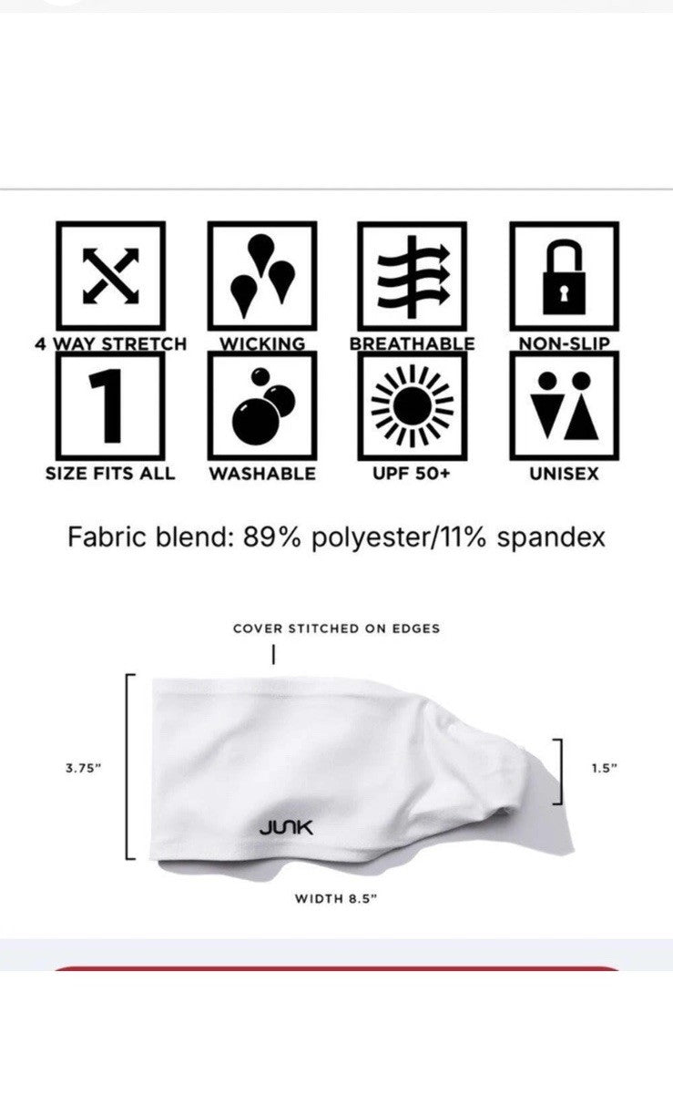 JUNK'S TECHNICAL T-SHIRT FABRIC IS A BREAKTHROUGH TECHNOLOGY SPECIFICALLY DESIGNED TO KEEP YOU COOL WHILE EMULATING A SUPER COMFORTABLE T-SHIRT FEEL. THIS IS THE BEST ATHLETIC HEADBAND YOU'LL EVER WEAR!