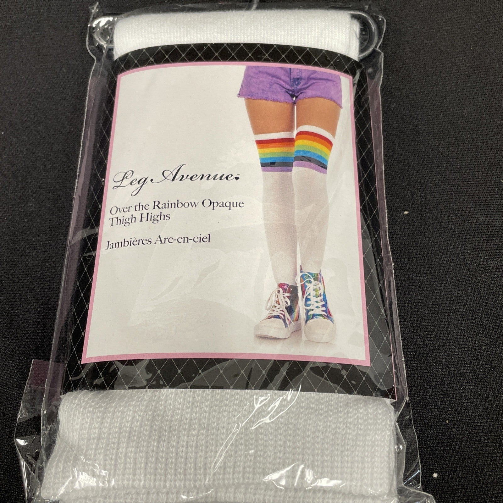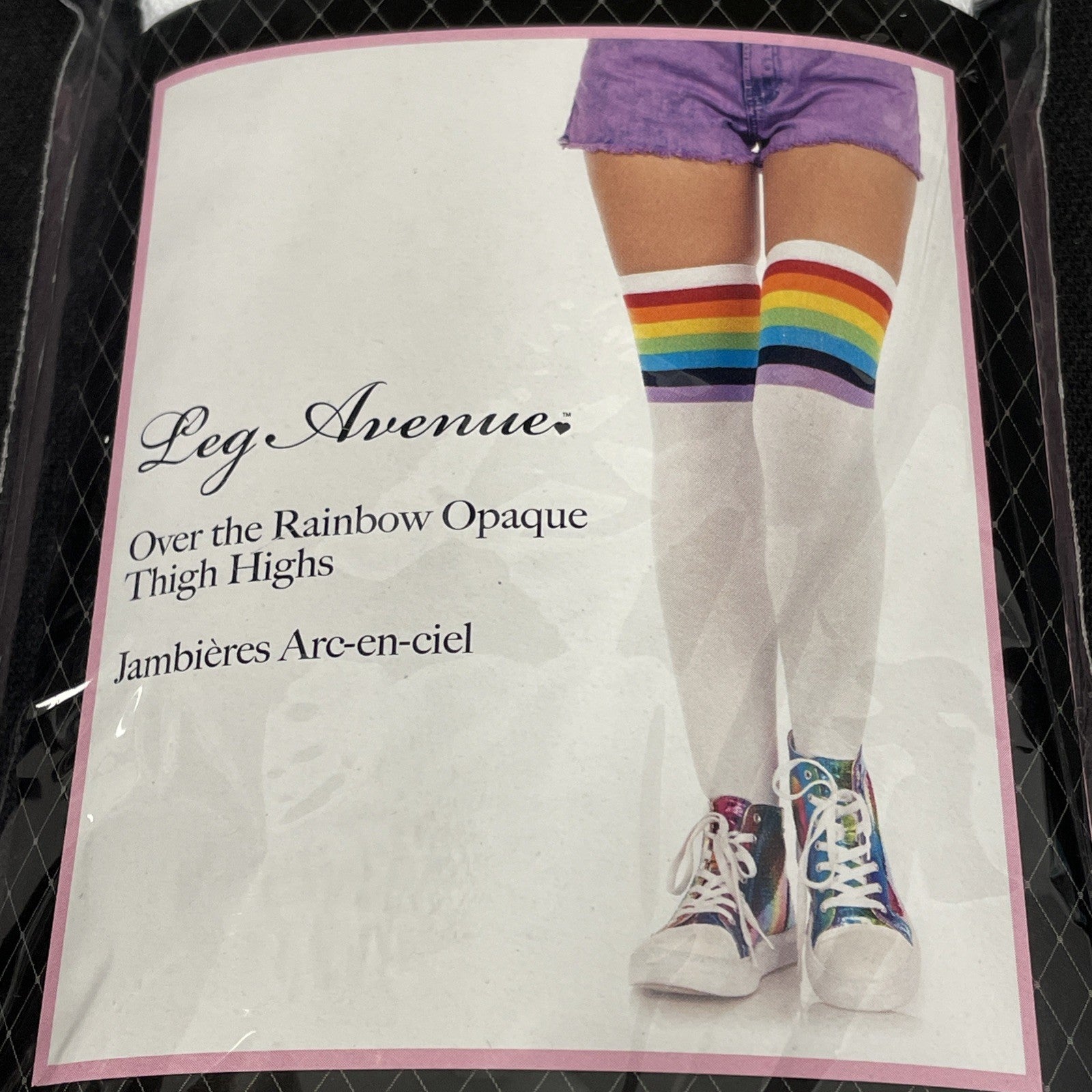 The product is a pair of Leg Avenue thigh-high stockings in an over-the-rainbow color scheme, featuring an opaque design. The one-size fits most style is designed for women and reaches over the knee, perfect for adding a colorful and whimsical touch to any outfit. With its vibrant rainbow theme, these stockings are sure to make a statement and bring a fun and playful touch to your ensemble.