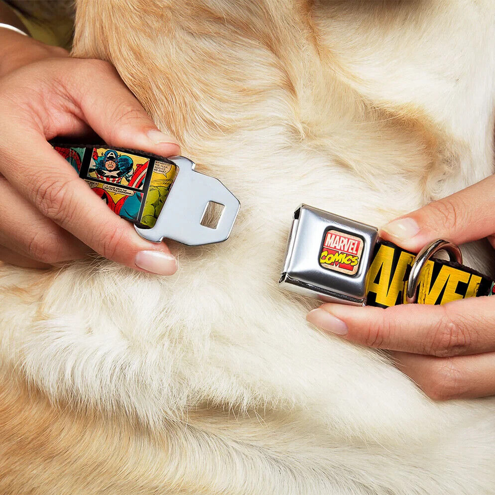 Your dog will be the talk of the town when people notice they're wearing this awesome SeatBelt Dog Collar! Made from high-density polyester and durable steel components, this collar is built to last. It features beautiful vibrant artwork. The buckle is a miniature authentic SeatBelt Buckle, so you press the center button to release the clasp. This product is Made in USA by Buckle-Down Inc. and officially licensed by Marvel Comics.