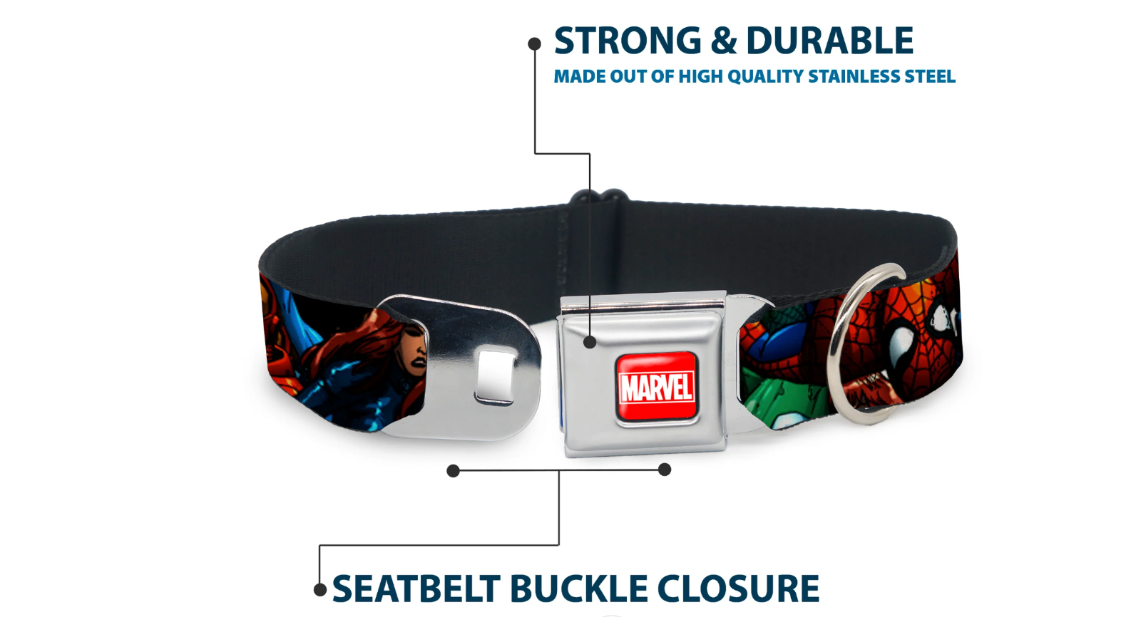 Your dog will be the talk of the town when people notice they're wearing this awesome SeatBelt Dog Collar! Made from high-density polyester and durable steel components, this collar is built to last. It features beautiful vibrant artwork. The buckle is a miniature authentic SeatBelt Buckle, so you press the center button to release the clasp. This product is Made in USA by Buckle-Down Inc. and officially licensed by Marvel Comics.