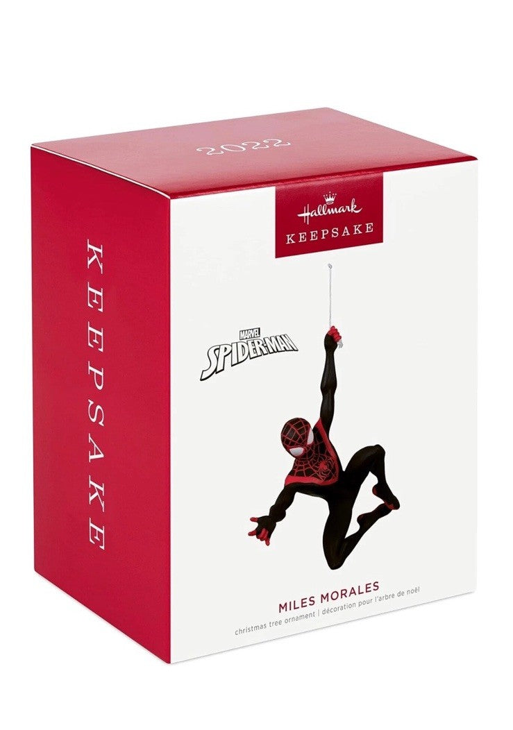 The product is a new 2022 Hallmark Spider-Man ornament featuring Miles Morales as the character. It's a multicolor, dangle-style ornament with a depth of 2 inches and a height of 5.31 inches. This RETIRED decorative tree ornament is part of the Marvel Spider-Man franchise and is a perfect addition to any fan's collection. The ornament is in mostly mint condition and comes in a box with the brand's signature tags attached.