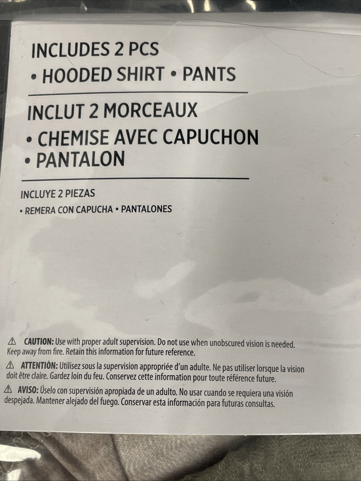 Includes hooded shirt and pants