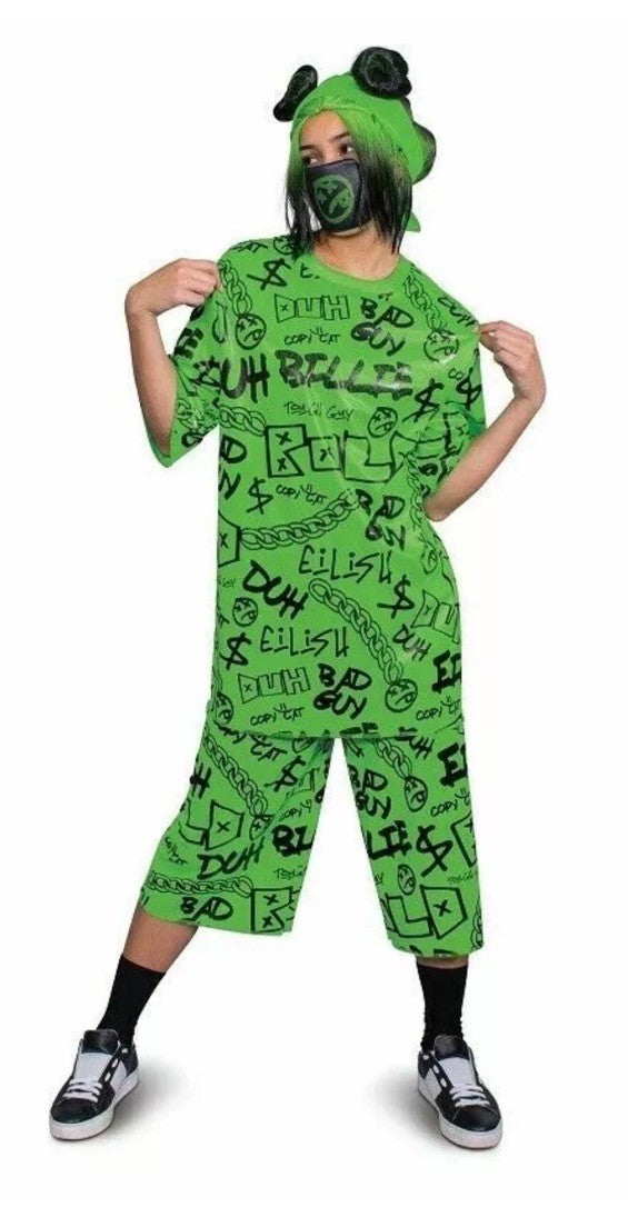 The product is a new Billie Eilish classic adult green costume designed by Disguise in adult size small. This cosplay set includes a top, shorts, headwrap, and face mask, all inspired by the celebrity theme. The multi-color design captures the essence of Billie Eilish's unique style, making it a perfect choice for fans looking to dress up for Halloween or special events. This costume offers a fun and stylish way to channel your inner Billie Eilish and stand out from the crowd.
