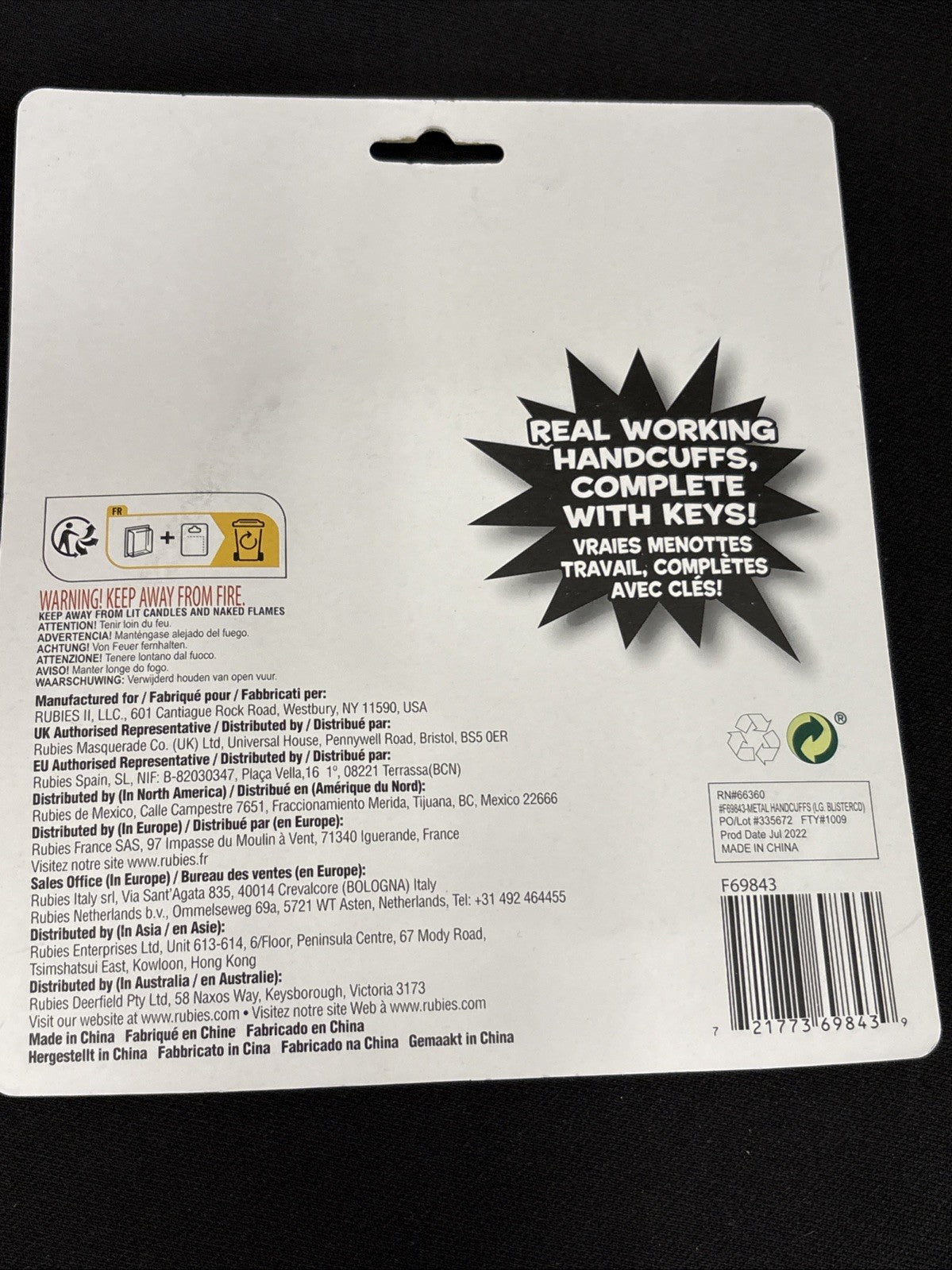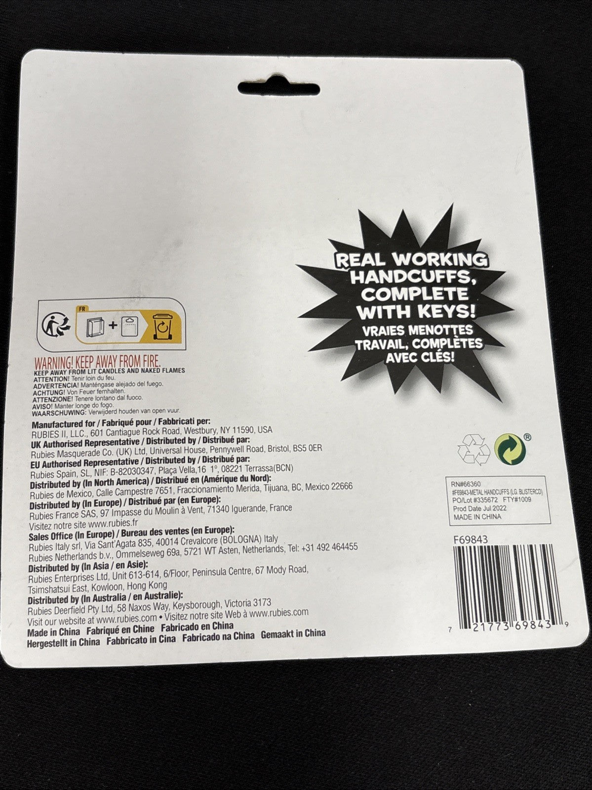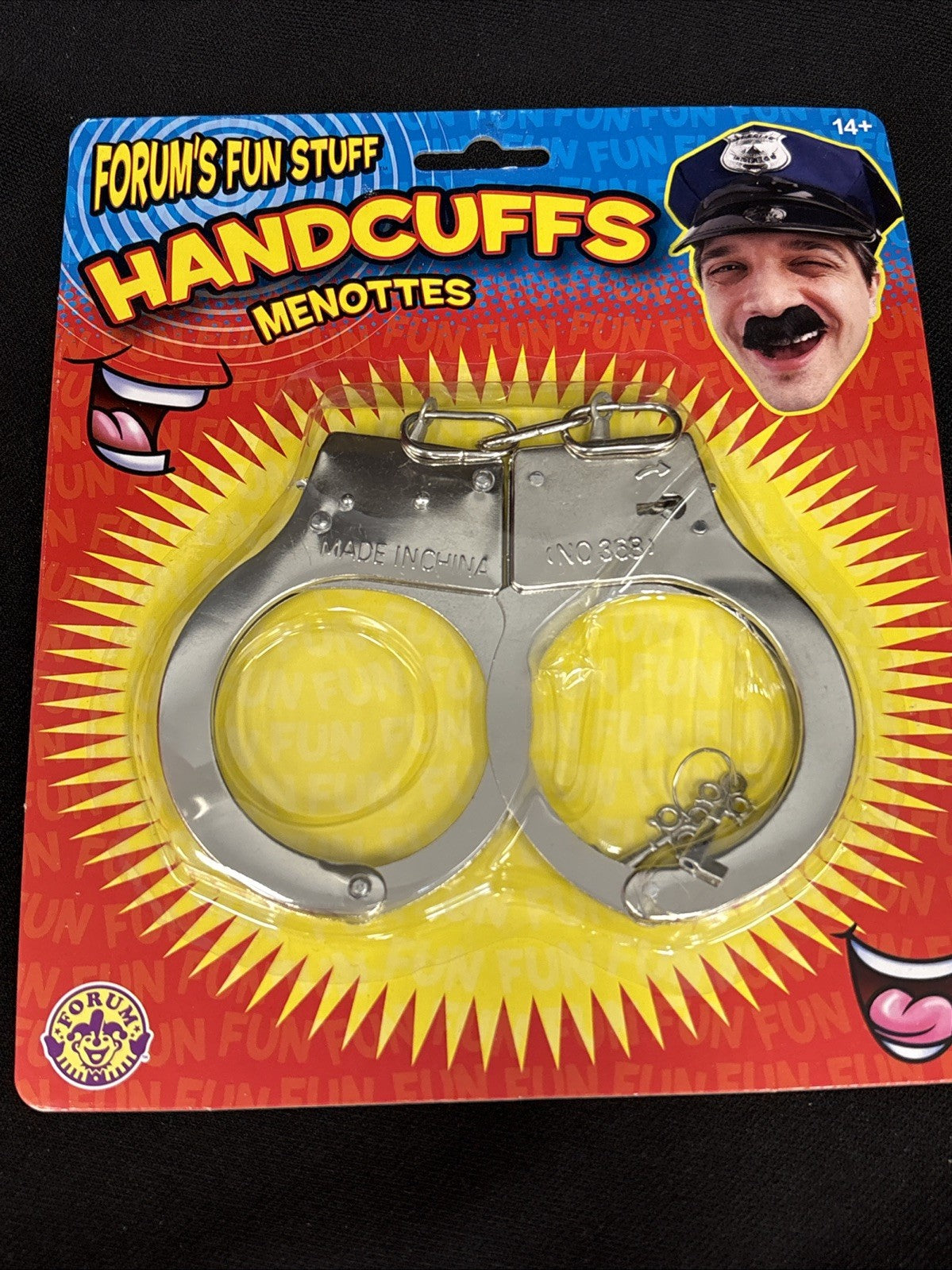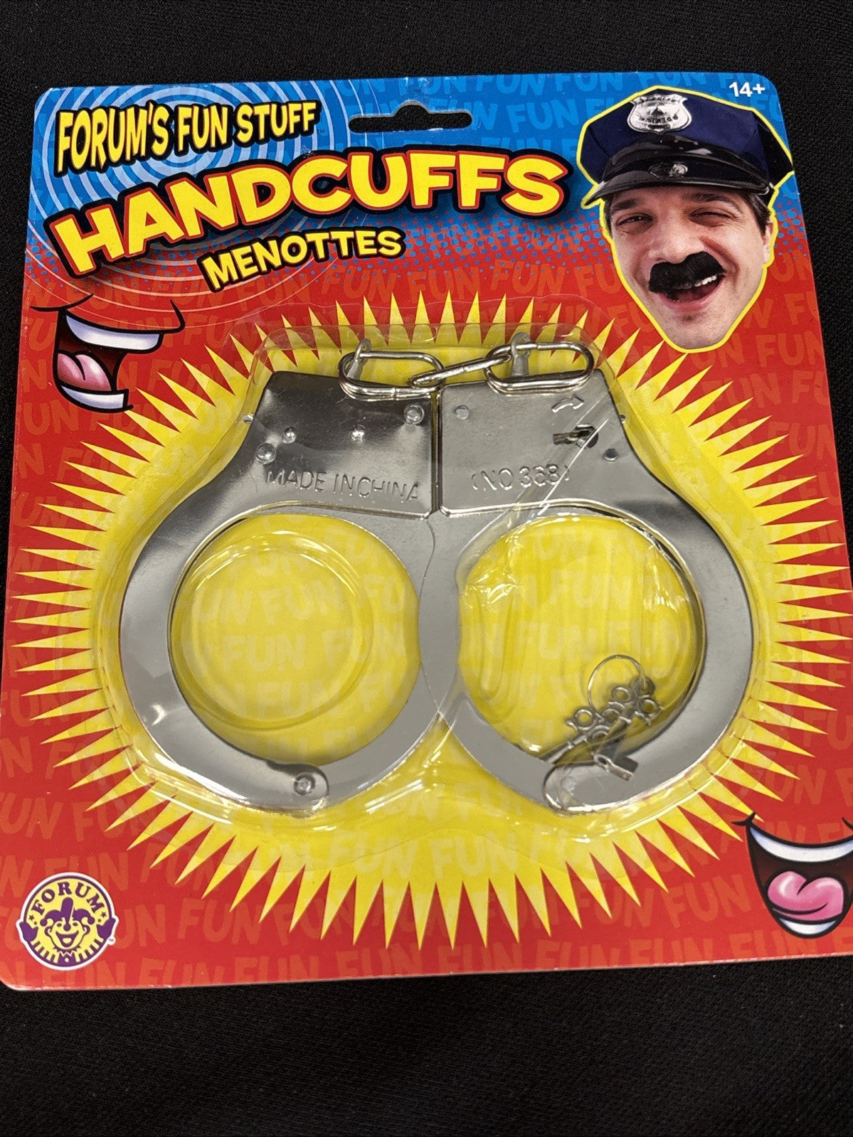 The Novelty Handcuffs Halloween Assesory by Rubie's is a playful and fun accessory perfect for Halloween costumes. The silver handcuffs are sized as one size fits most, making them versatile for various individuals looking to add a touch of whimsy to their outfit.