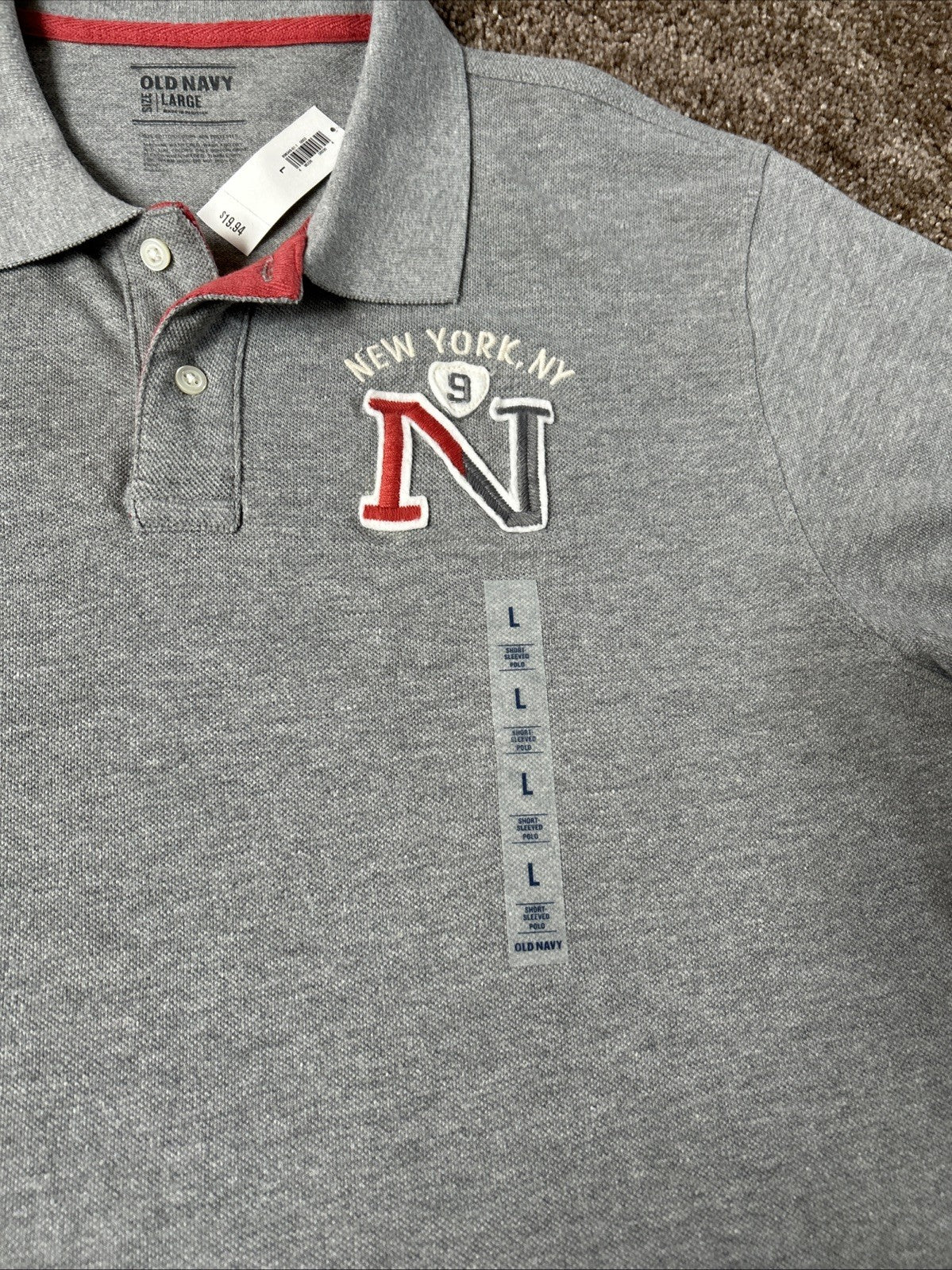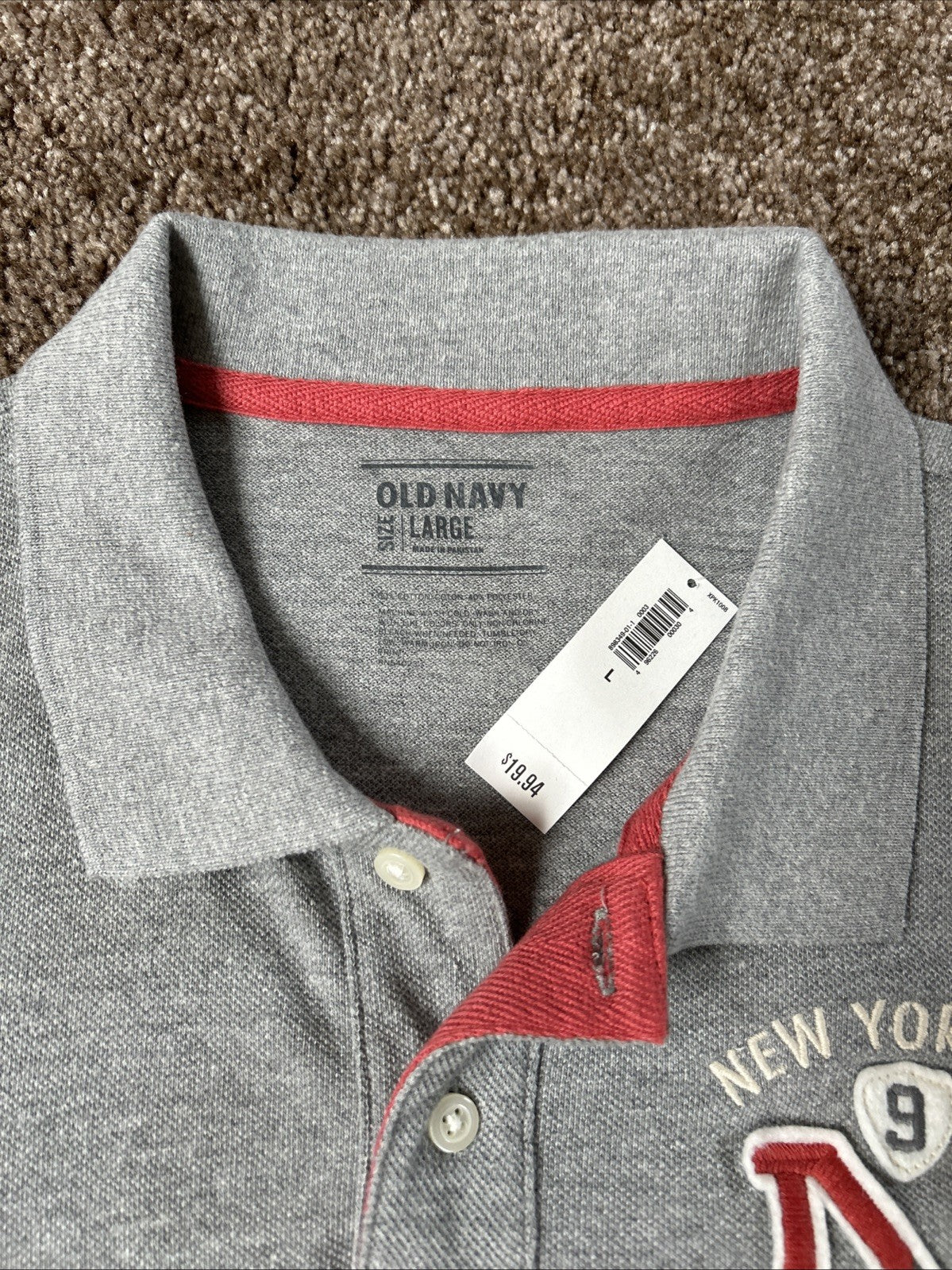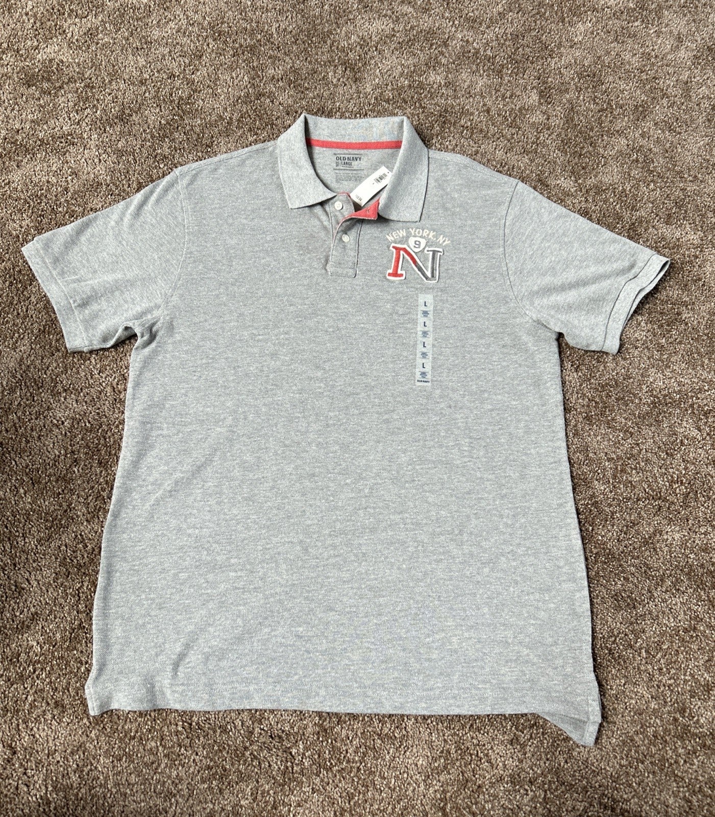 This Old Navy polo shirt for men features a classic design with a collared neckline and short sleeves, perfect for casual wear. The gray color adds a versatile touch to the wardrobe, while the size Large ensures a comfortable fit. Made by the popular brand Old Navy, this new with tags shirt is a stylish addition to any man's clothing collection.