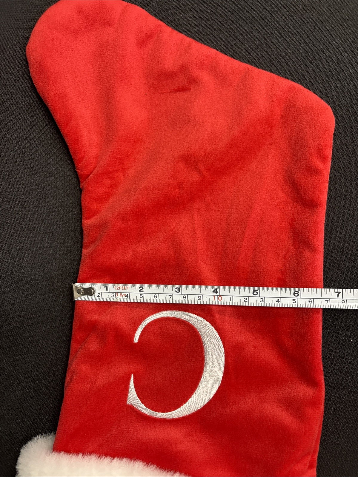 This luxurious RED VELVET Initial WHITE FUR CUFF MONOGRAM C CHRISTMAS STOCKING is perfect for adding a touch of elegance to your holiday decor. Made from velvet with embroidered embellishments and a faux fur cuff, this stocking is both stylish and festive. The monogrammed letter adds a personalized touch, while the red and white color scheme gives it a classic Christmas look. Measuring 17 inches in length and 6.5 inches in width, this stocking is sure to be a beautiful addition to your mantle or shelf.