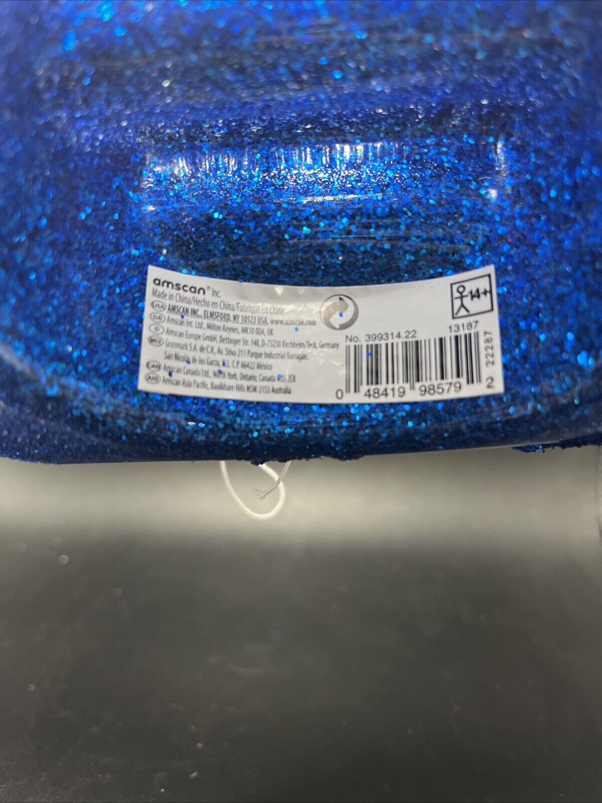 The product is a very small cowboy hat in royal blue with sparkle accents, designed by Amscan. Made of plastic, this costume accessory or party decoration is perfect for adult unisex wearers looking to add a touch of cowboy flair to their outfit. The hat is themed around cowboy/western style and comes from China. Ideal for various occasions where a small yet eye-catching hat is needed to complete a unique look.