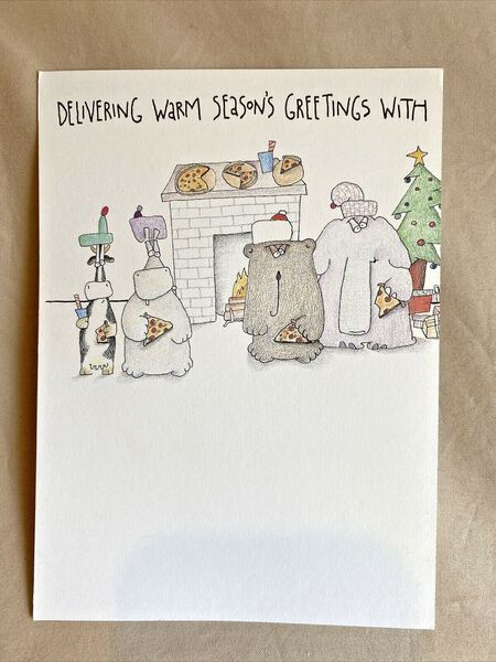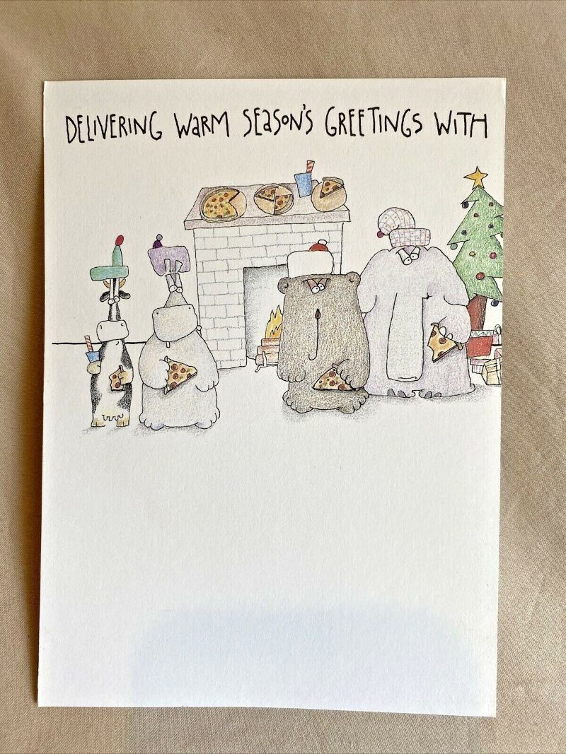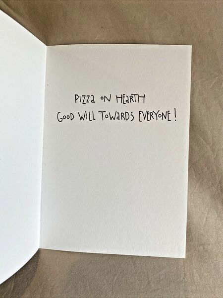 Seasons Greetings Greeting Card w/Envelope NEW. Condition is "New". Outside: Delivering Warm Season's Greetings With Inside: Pizza on Hearth Good Will Towards Everyone! NEW Ask about combined shipping on all greeting cards GC712