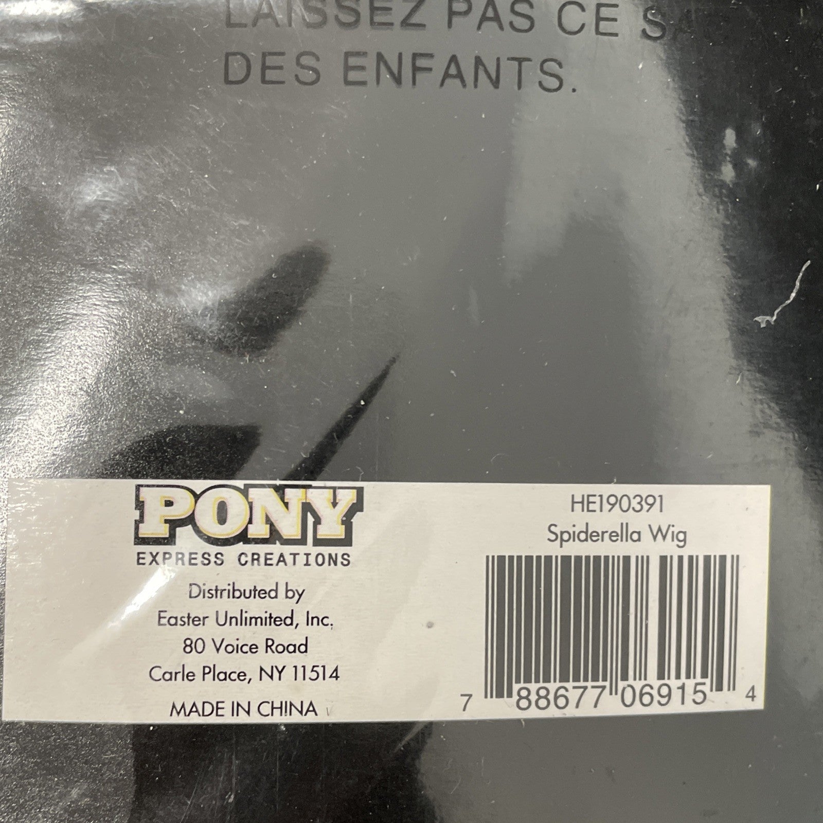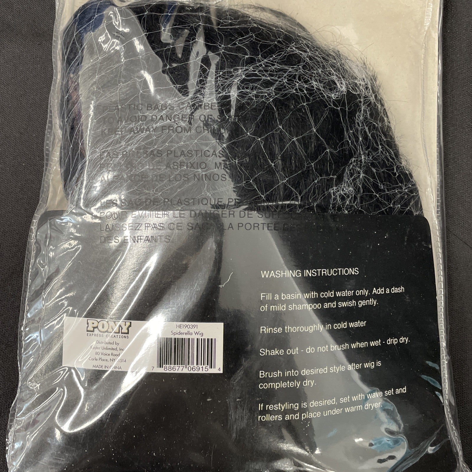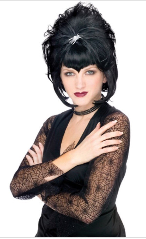 The Spiderella Bouffant Wig is a fashionable accessory that can be worn with a variety of costume ensembles for your costume party or other Halloween event. This black Halloween wig features a widow s peak bangs and a silver spider accent. It is made of nylon and comes in one size that fits most adult wearers.