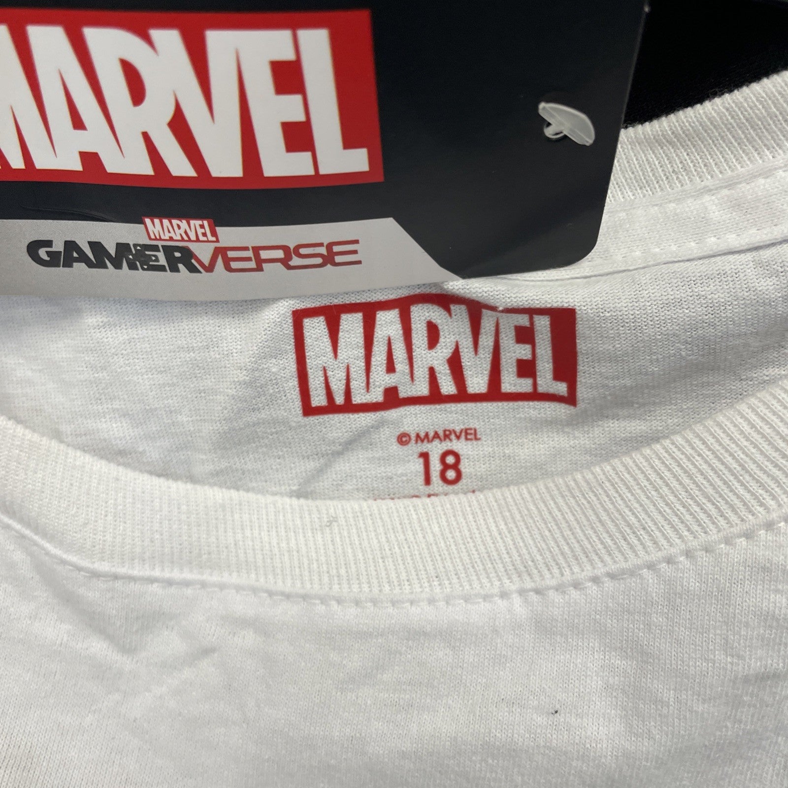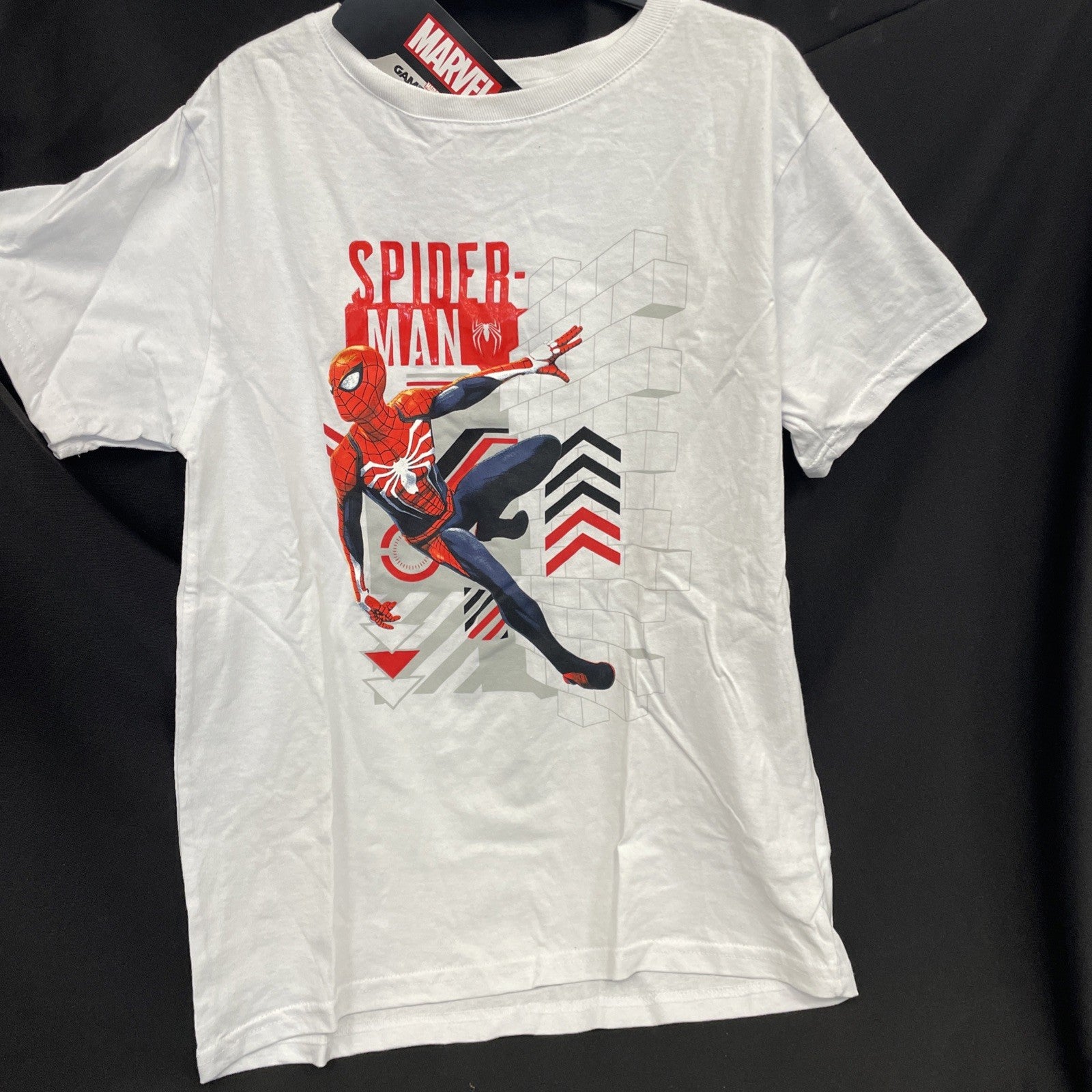 This is a Del Sol brand T-shirt for boys in size 18. The shirt features a Spider-Man superhero theme white short sleeve graphic tshirt. It has a pullover closure and is made of 100% cotton material.