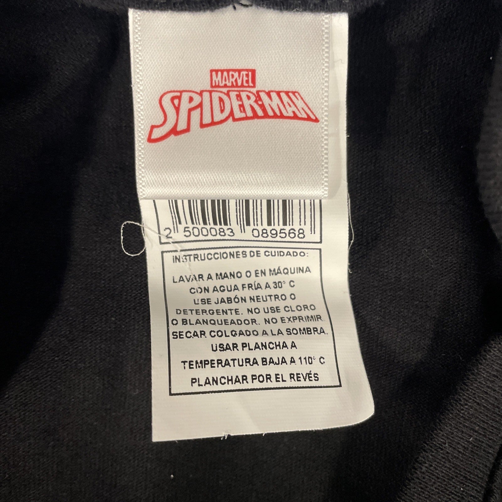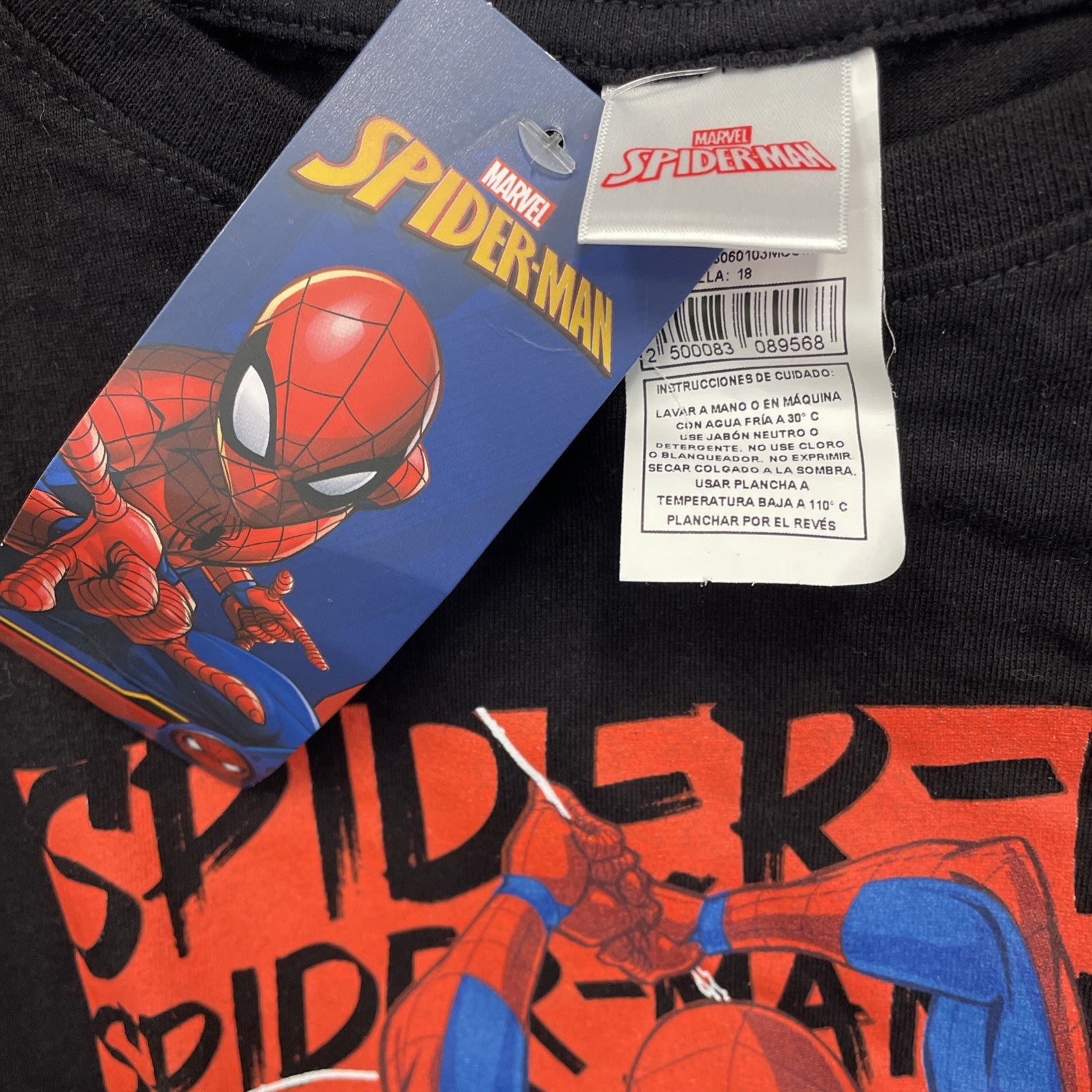This is a Del Sol brand T-shirt for boys in size 18. The shirt features a Spider-Man superhero theme with black short sleeve tshirt. It has a pullover closure and is made of 100% cotton material.