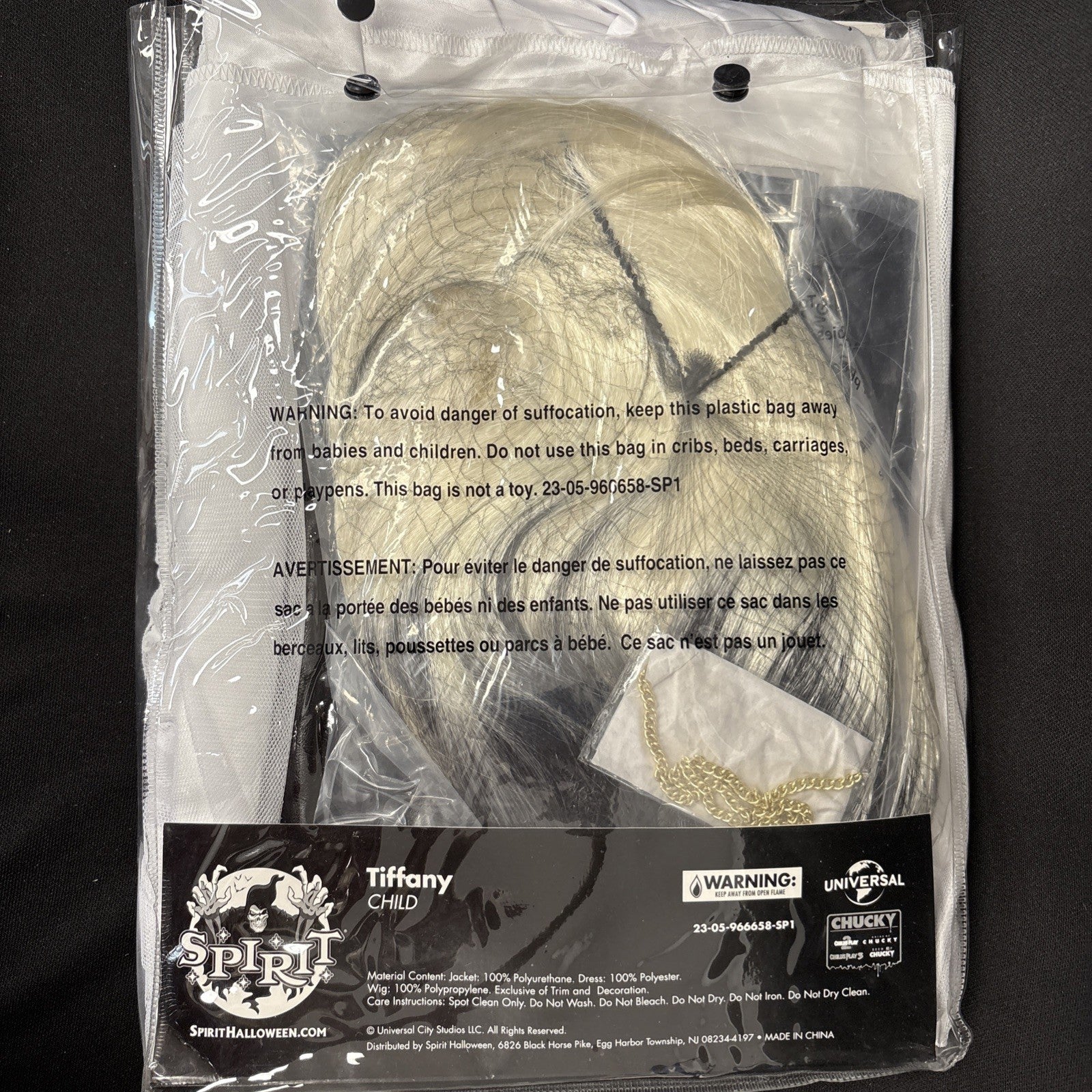 The Spirit Halloween Tiffany Costume in Adult XL size (14-16) is a horror-themed dress and wig set that includes a necklace and jacket. Made of polyester material in a white color, this juniors' style costume is designed for Halloween celebrations. The outfit features the iconic look of the character Tiffany from a horror film, perfect for those looking to add a spooky touch to their costume collection. Made by the Spirit brand in China, this costume offers a complete and themed look for a memorable Halloween party or event.