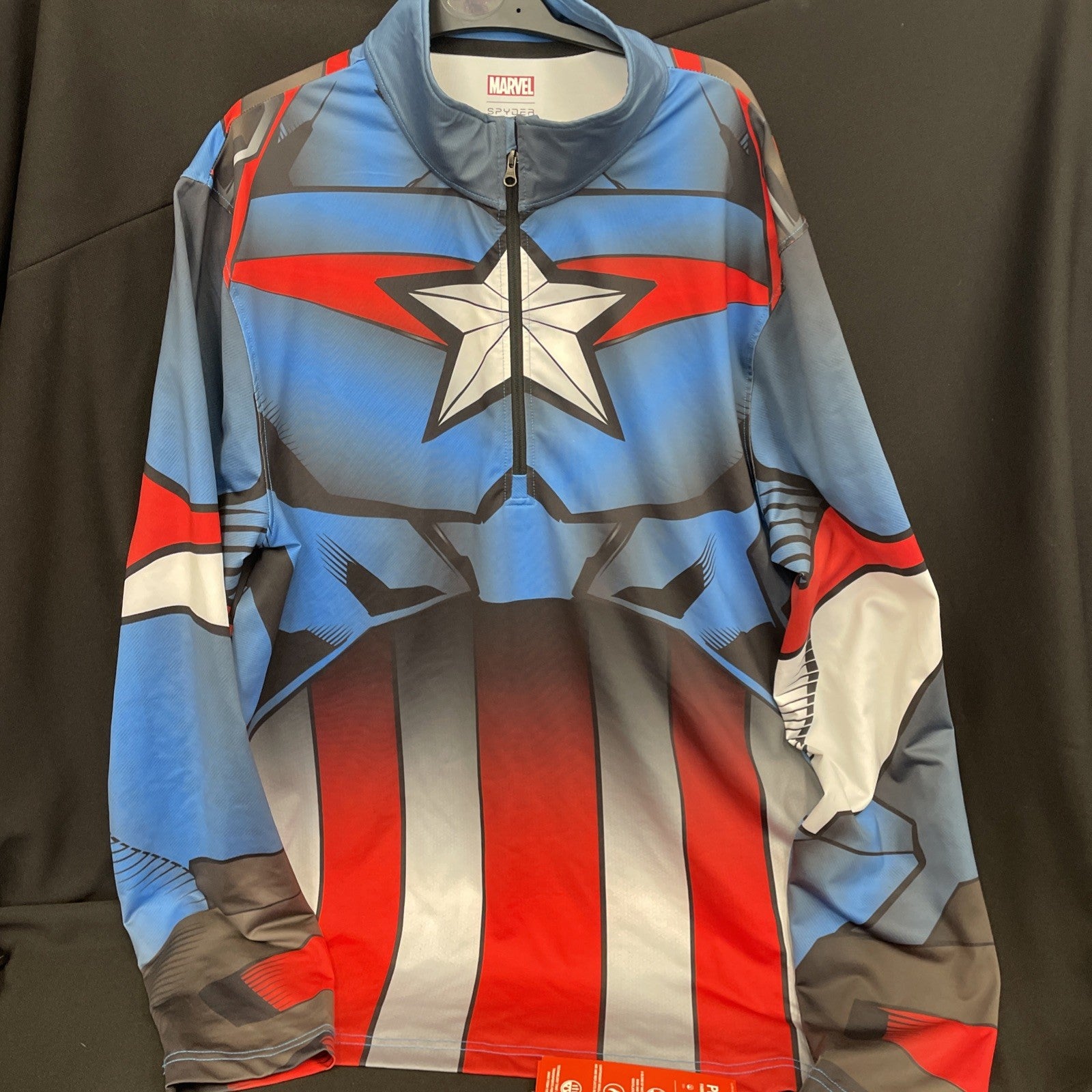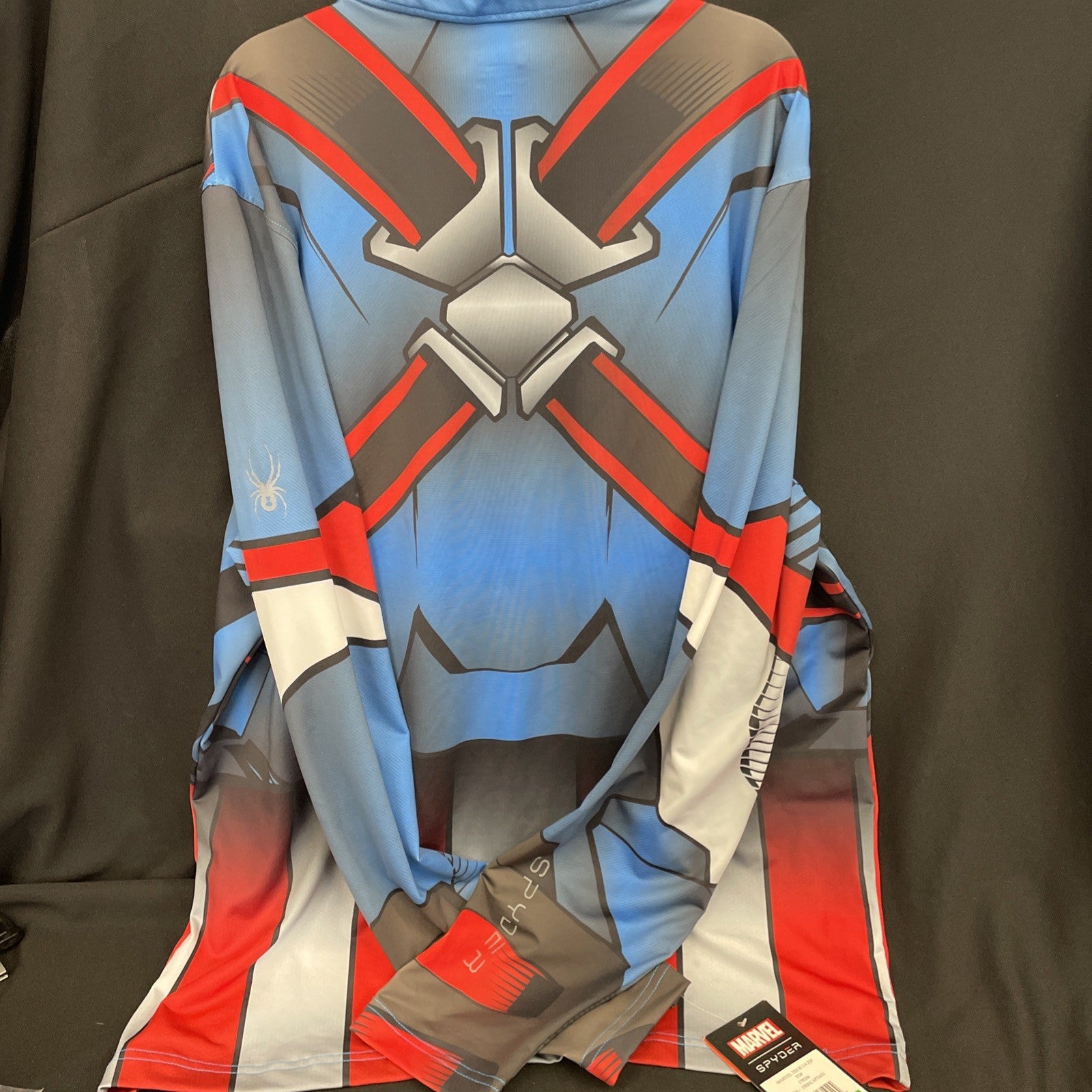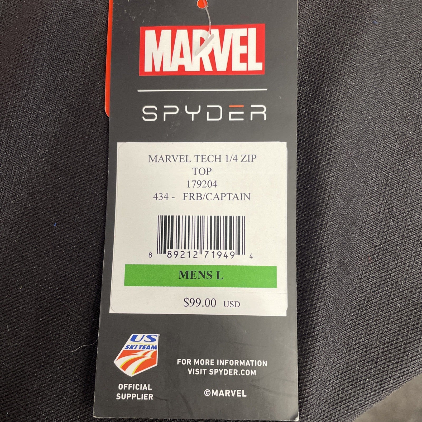 Stay warm and comfy when you're taking on your latest rival with this Spyder Marvel Tech 1/4 Zip pullover! Dry W.E.B.: Dry W.E.B polyester knit fabric that pulls moisture away from the skin and spreads it over a larger area so that it can evaporate more easily. Keeping you on the go by letting you stay dry and warm! ⢠360° Stretch melange polyester knit provides a wide range of motion. Mock collar provides a little extra coverage when fully zipped up. Reverse coil 1/4 zip closure allows you to regulate your core temperature more easily. Long sleeves. Allover Marvel print pattern. Reflective branding by right cuff. 80% polyester, 20% spandex. Machine wash, tumble dry. Imported. Measurements: Length: 30 in Product measurements were taken using size MD. Please note that measurements may vary by size.