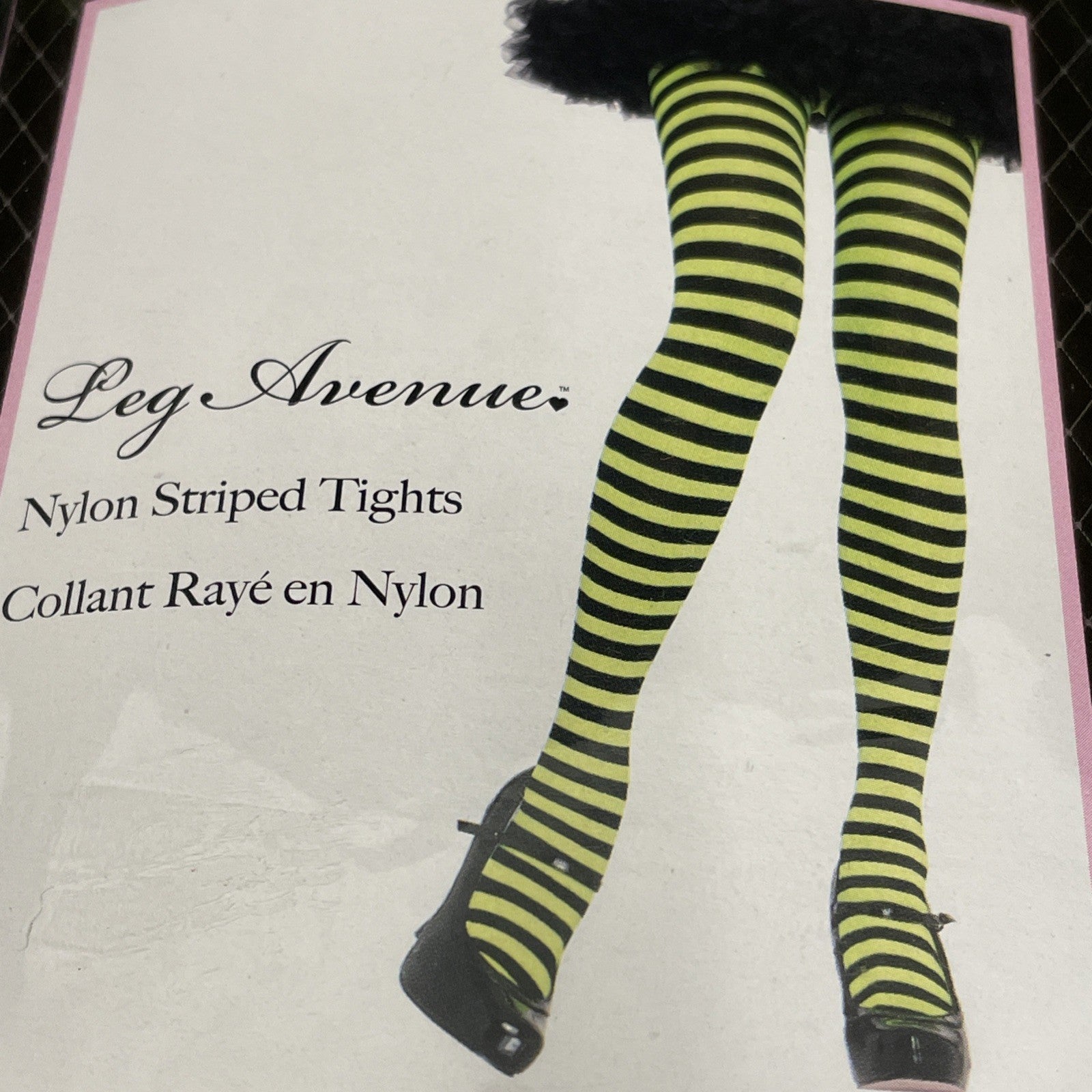 The product is a pair of bright green and black striped tights from the brand Leg Avenue. These OSFM (One Size Fits Most) costume tights are perfect for Halloween or special occasions, adding a fun and vibrant touch to any outfit. Made for women, these tights are designed to be stylish and comfortable for a wide range of sizes. Perfect for adding a pop of color and a trendy twist to your ensemble.