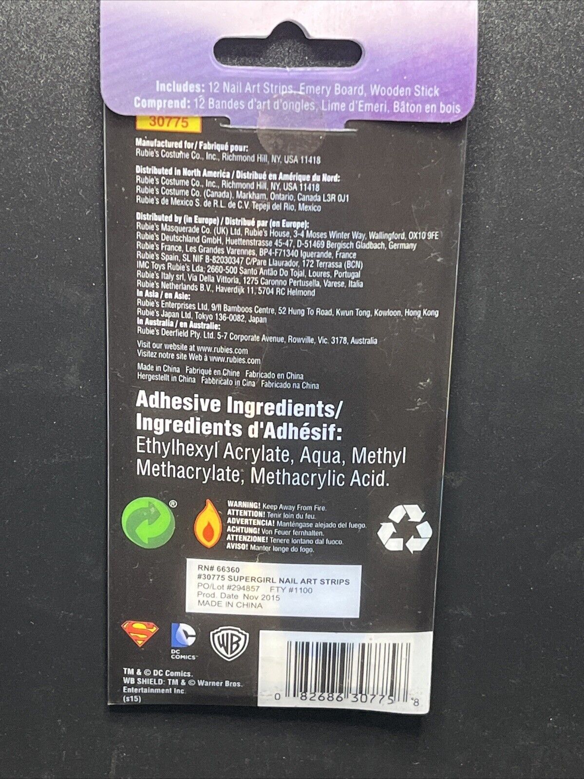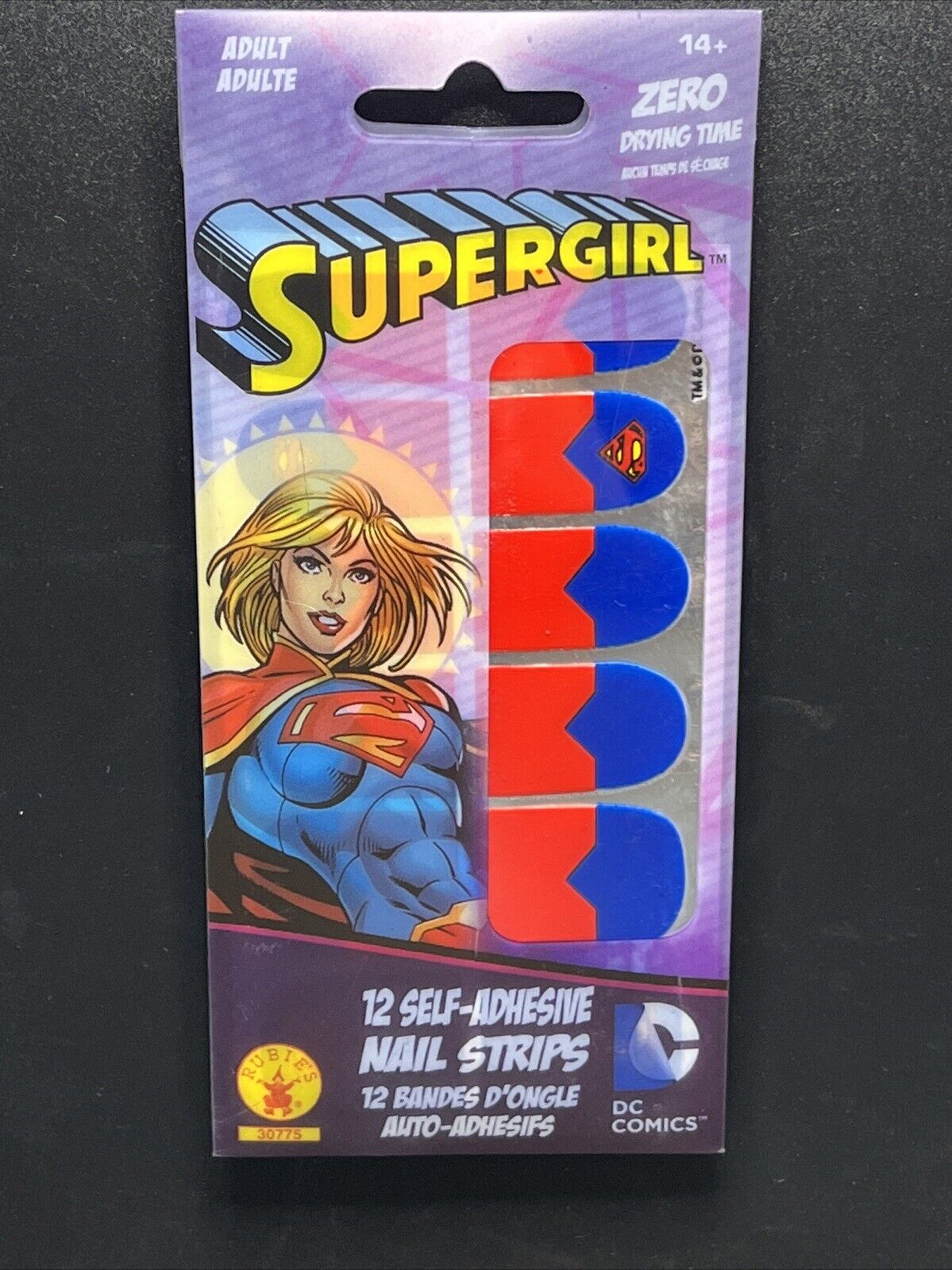 This is a Supergirl nail decal kit by Rubies, designed for women. The kit includes 12 self-adhesive nail strips in blue and red colors featuring the Supergirl logo. It is one size fits all and perfect for adding a fun and stylish touch to your nails.