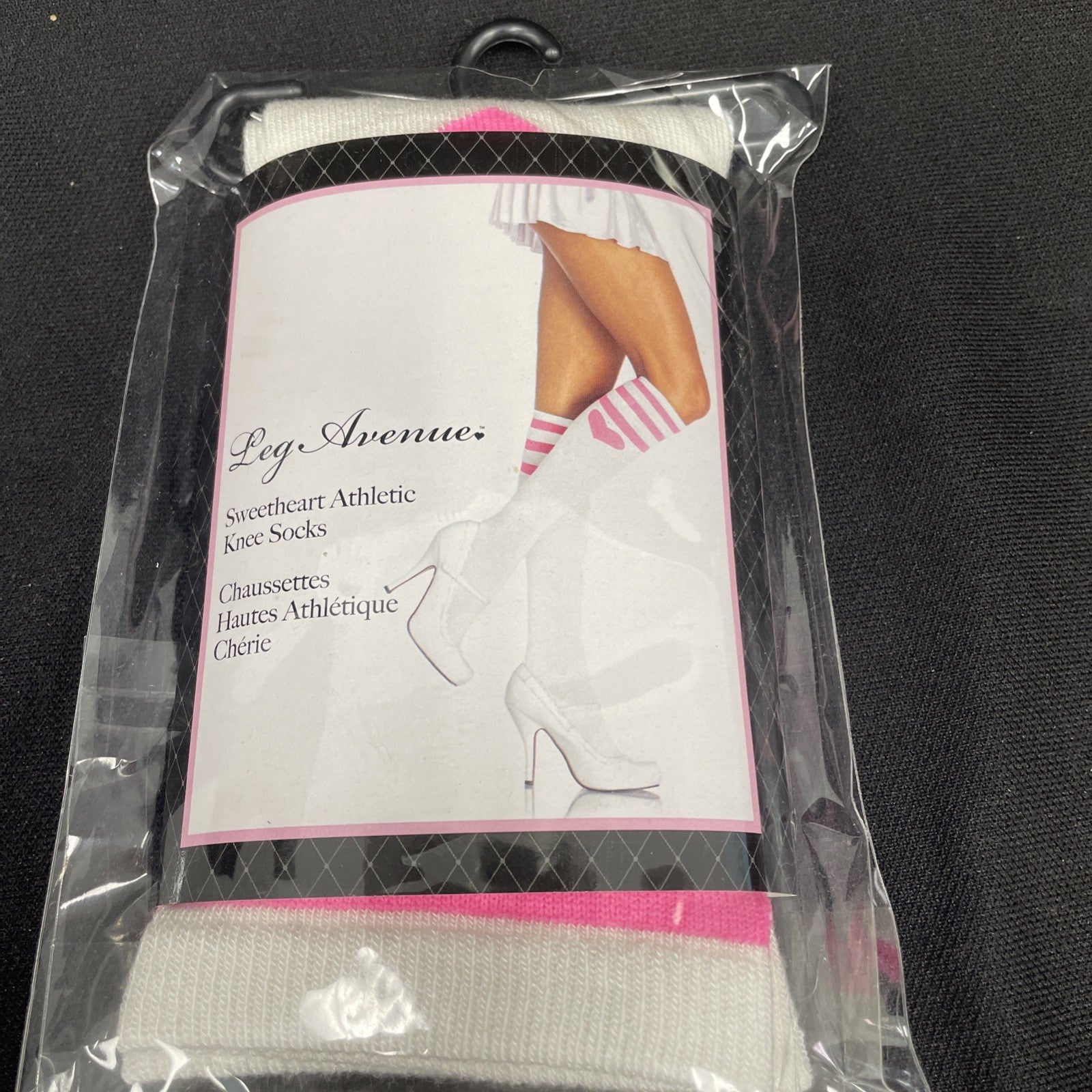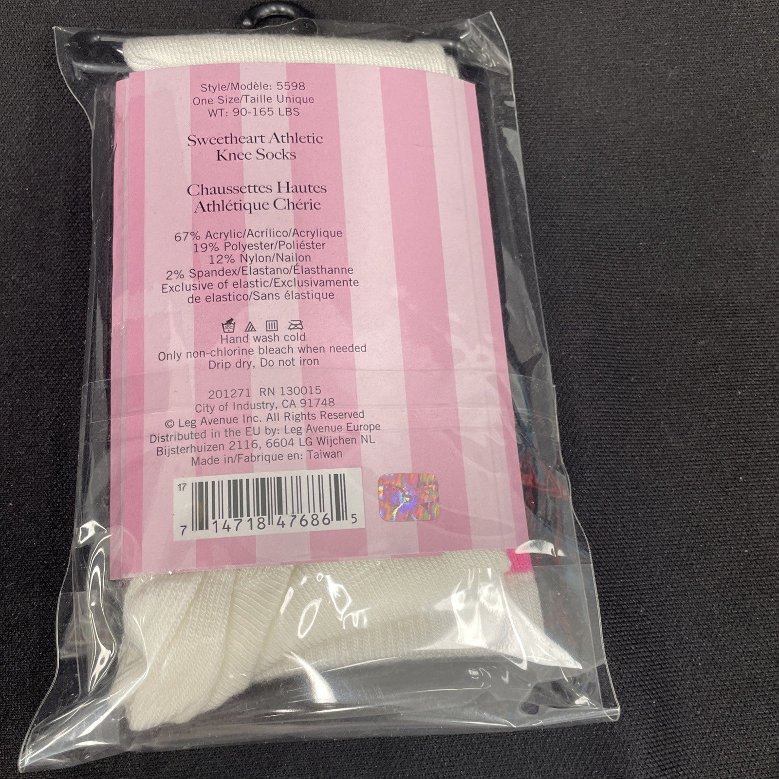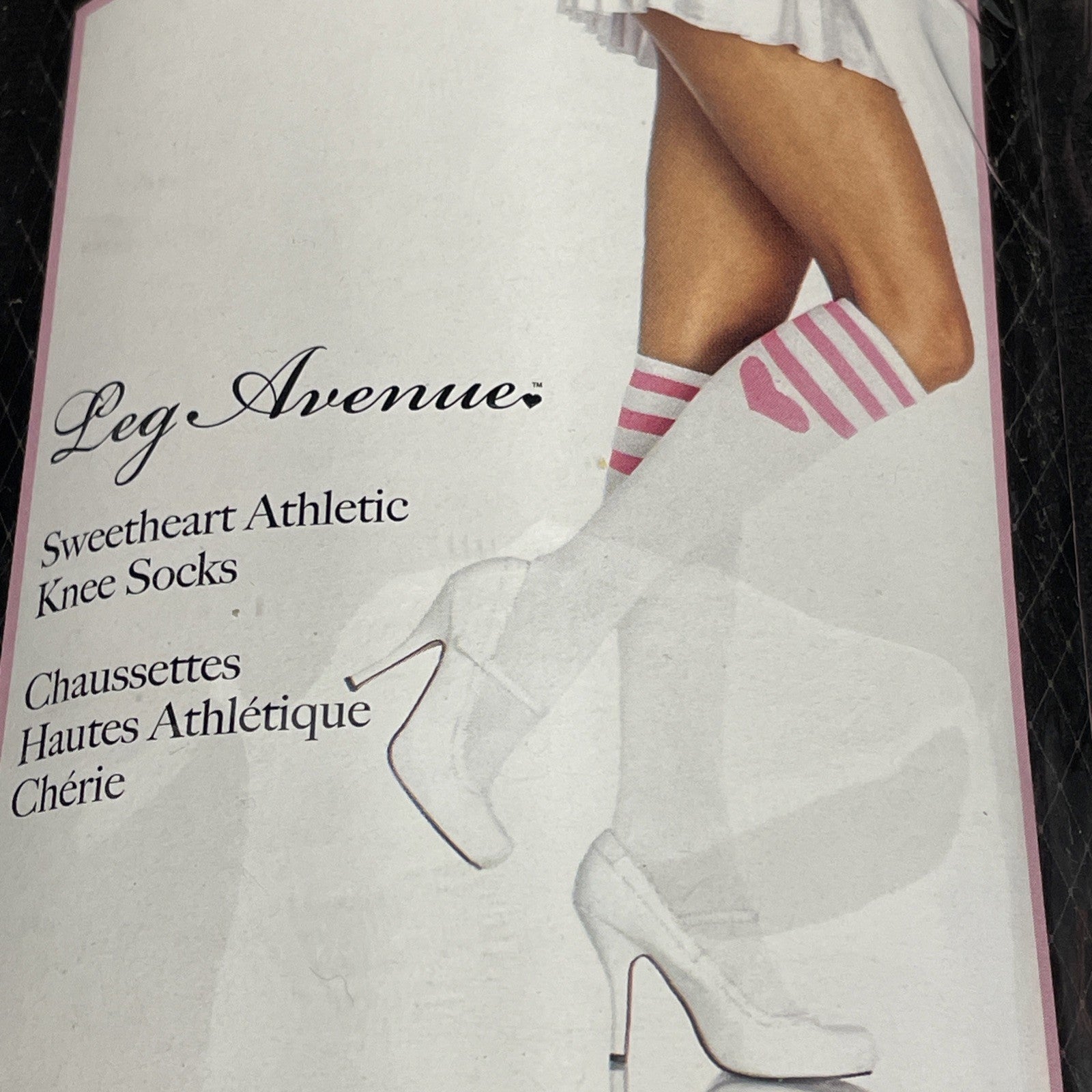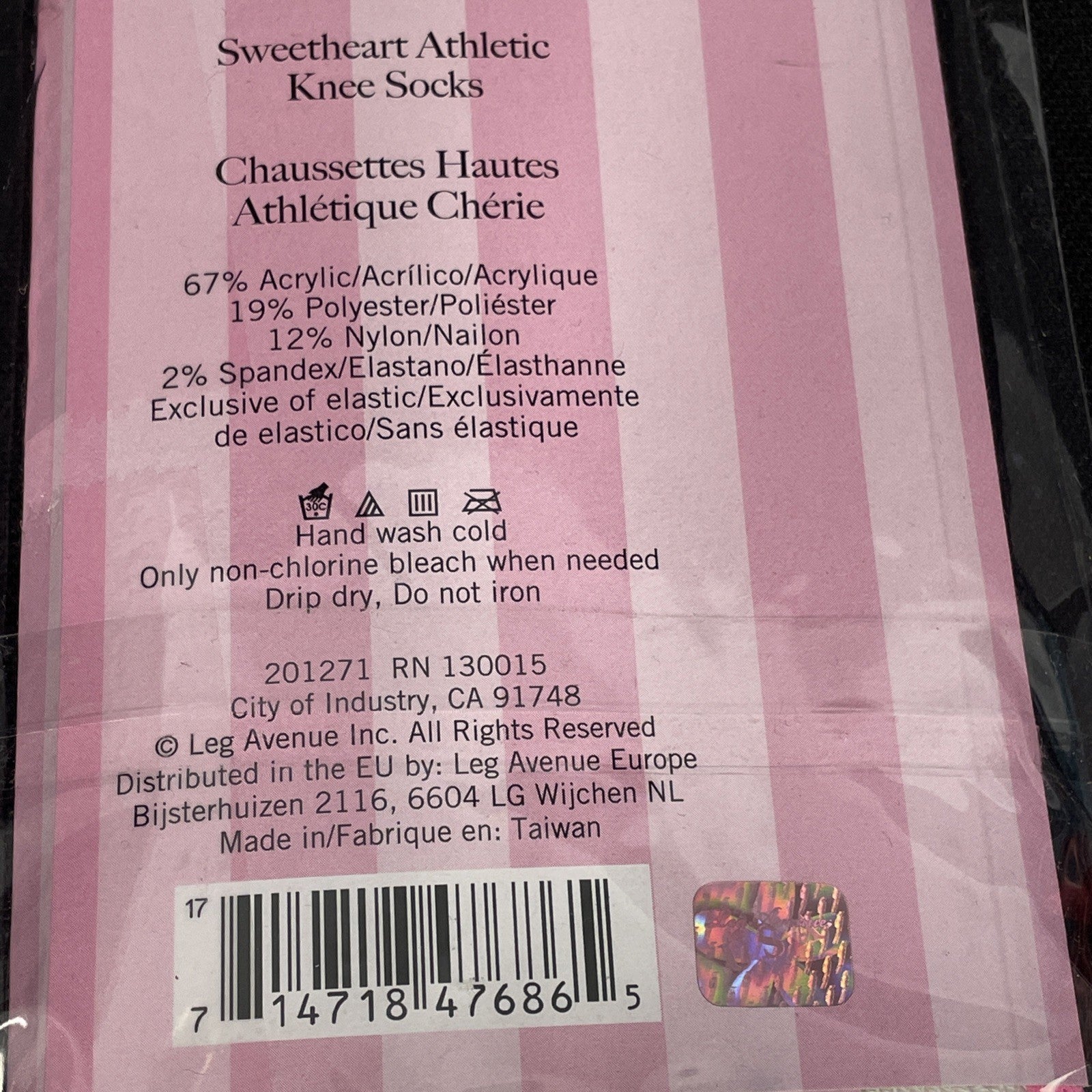 These Sweetheart Athletic Knee Socks by Leg Avenue are the perfect addition to a schoolgirl cosplay or Valentine's Day costume. Made of a blend of acrylic, polyester, and spandex, these knee-high socks feature a pink color with a striped pattern and heart detailing. The lightweight and semi-opaque design is ideal for gym workouts or training activities, adding a touch of style to your athletic ensemble. Perfect for women looking to channel their inner schoolgirl crush in a fun and playful way.