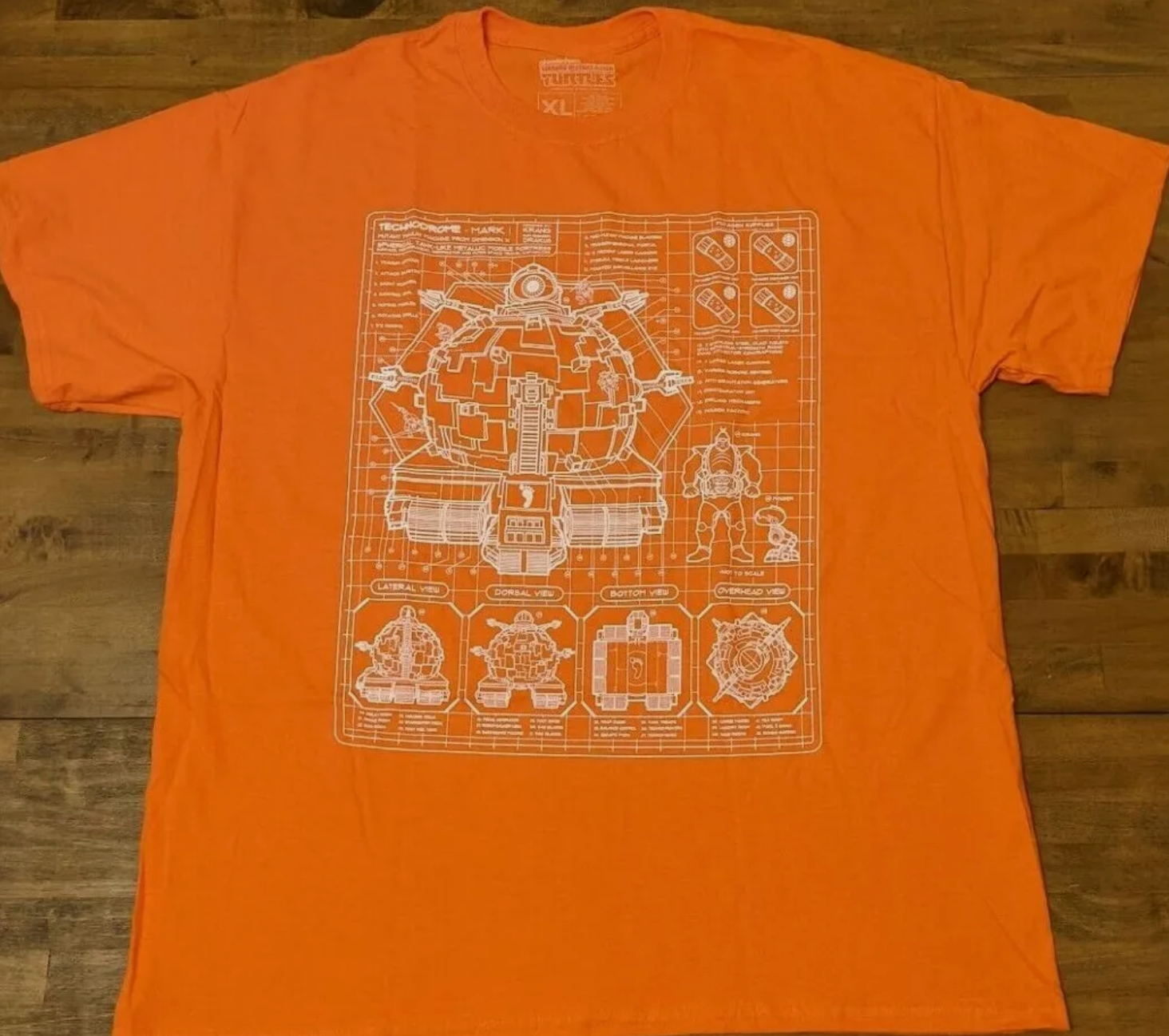 This orange t-shirt looks like a blueprint of something, and it’s the Technodrome from Teenage Mutant Ninja Turtles! The Technodrome is a semi-spherical, tank-like mobile fortress operated by different incarnations of the Krang. The print even features its lateral, dorsal, bottom, and overhead view, so you can really see how the drome looks like. They even included its different features!