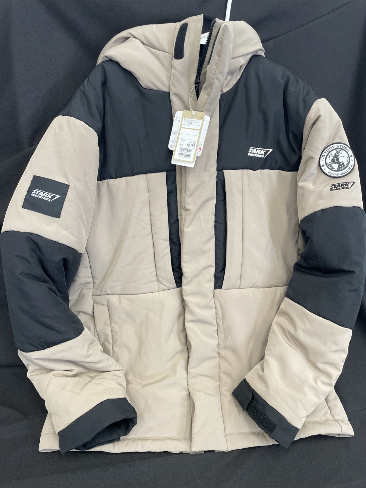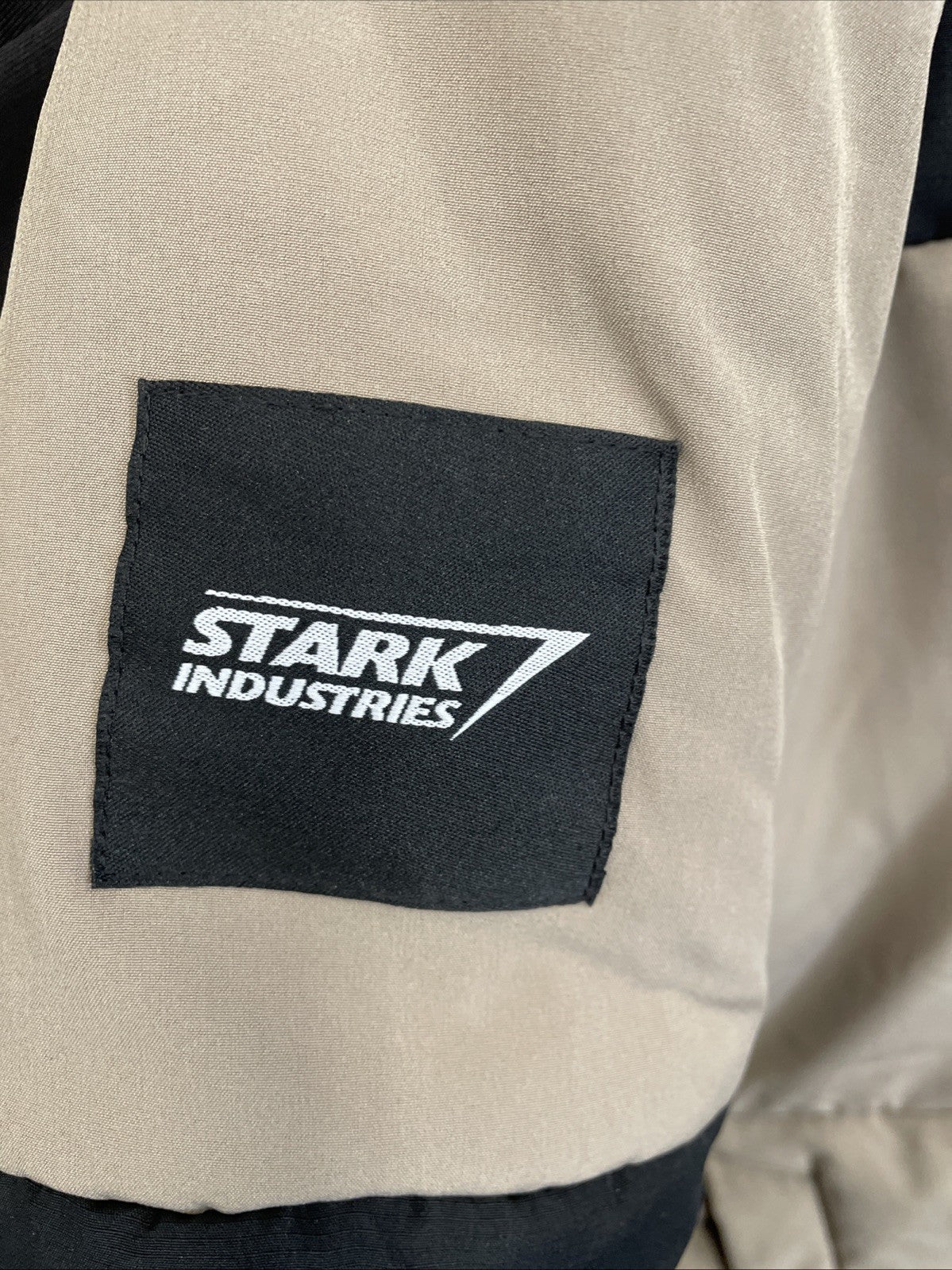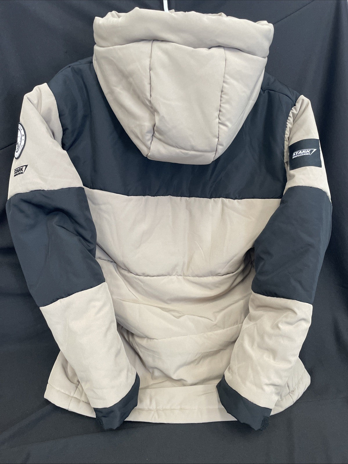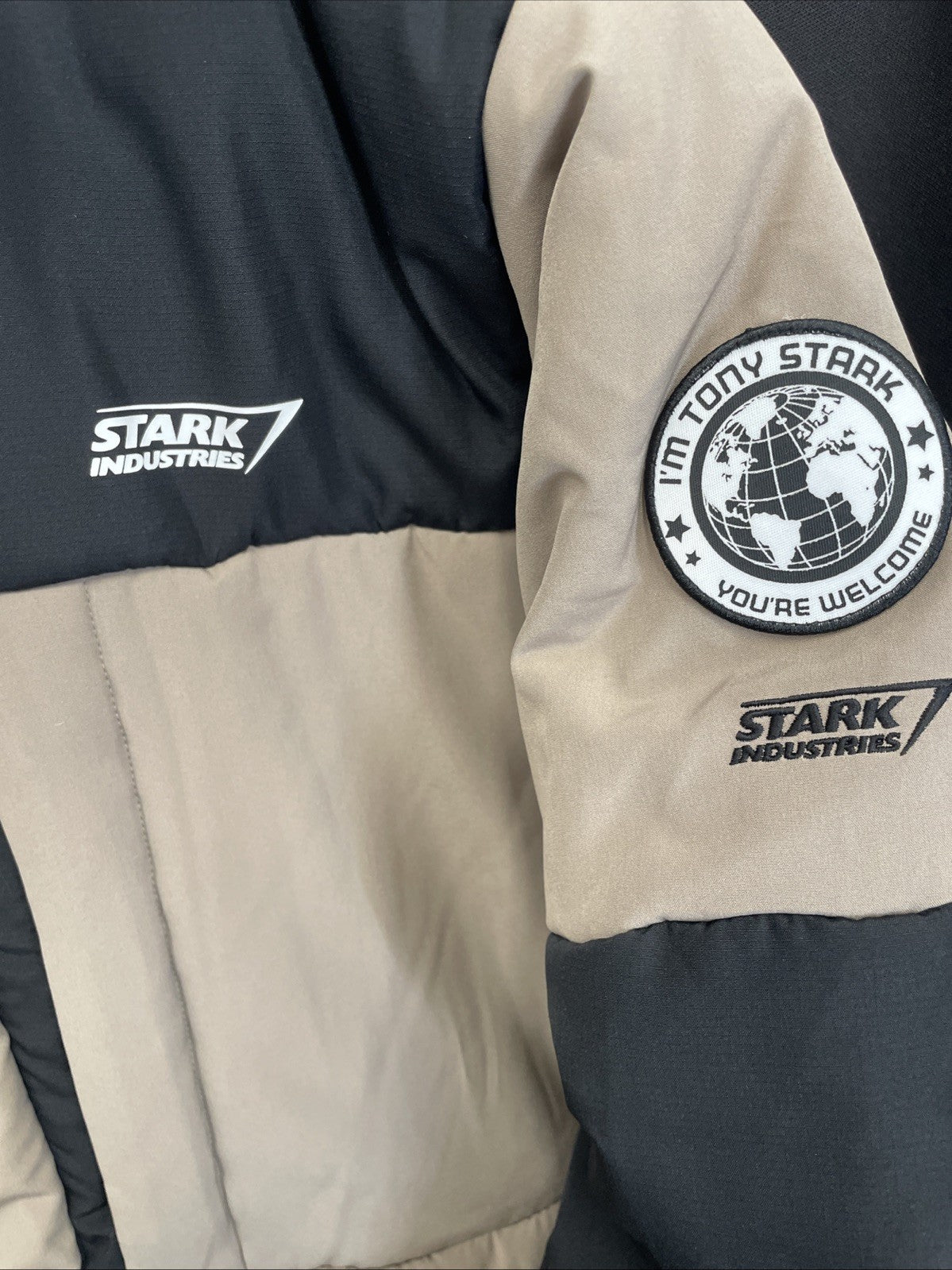 The Tony Starks Industries adult Winter Jacket in size large is a stylish and practical puffer jacket made from 100% polyester, perfect for keeping kids warm in the winter season. Featuring a zip closure and long sleeves, this unisex kids jacket comes in a cool brown color with a Marvel theme, making it a fun and unique choice for young fans of the superhero genre. Detachable hood and front pockets. Perfect for both boys and girls, this jacket combines functionality with a touch of fandom flair.