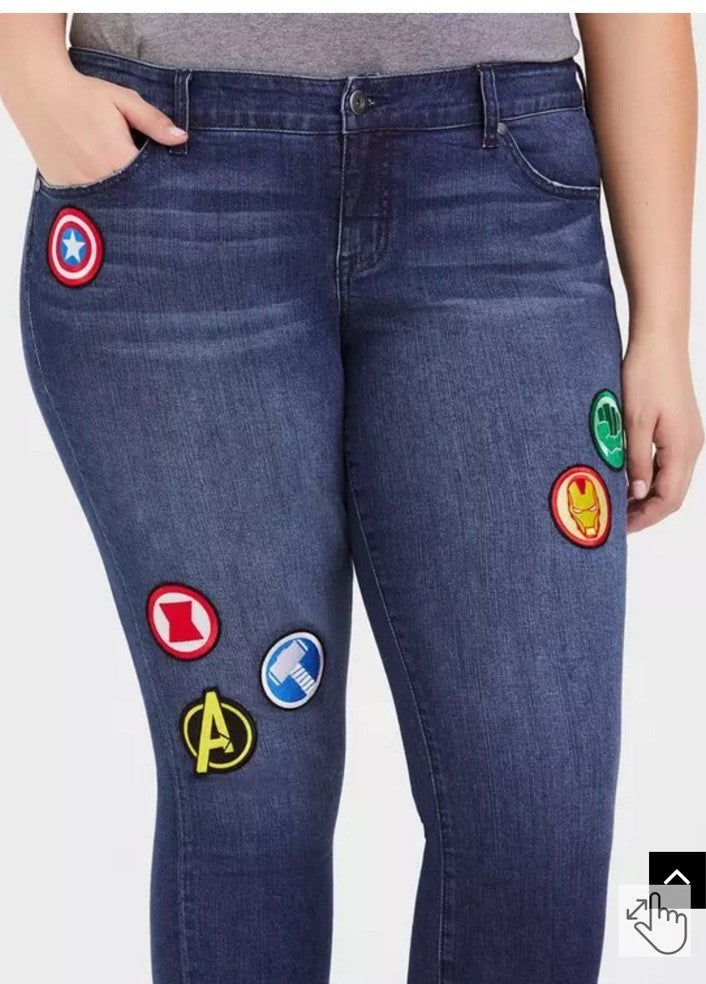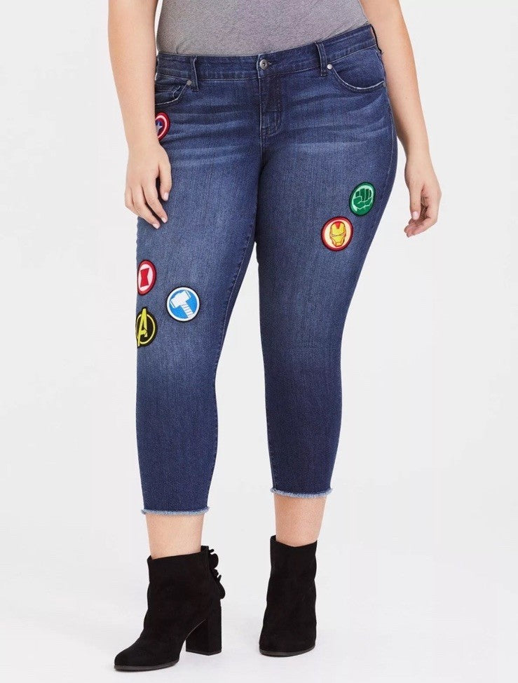 Marvel patches add a pop of color to a cropped skinny jean that's lean and sexy with a little wiggle room at the hem.