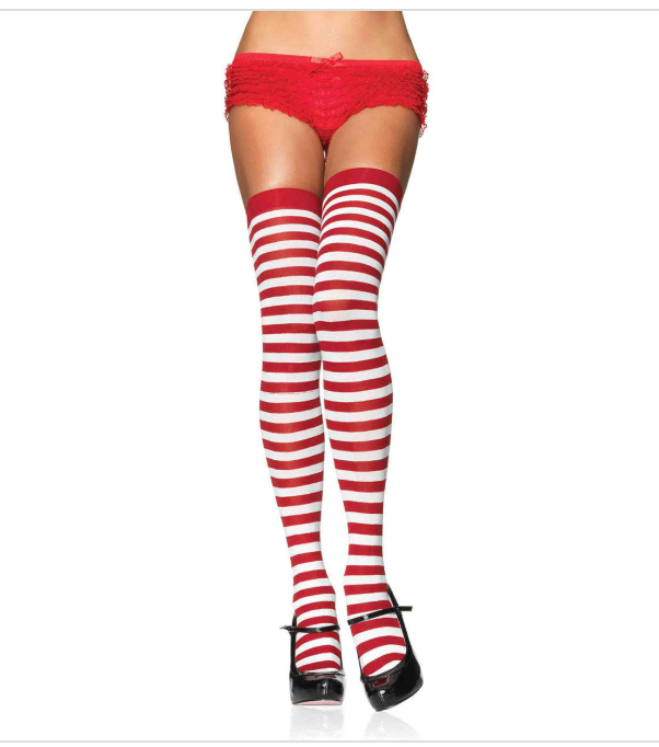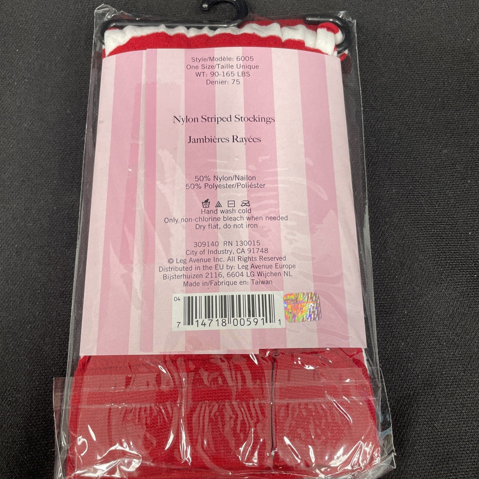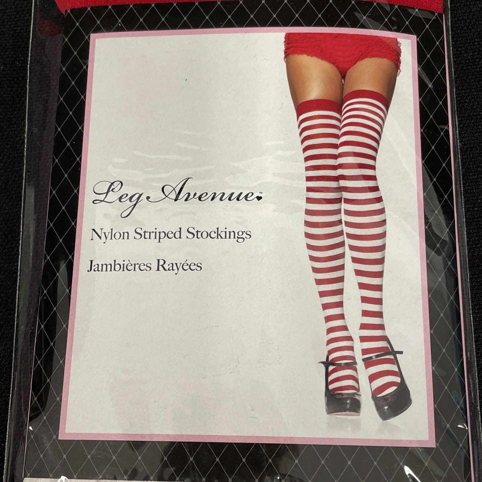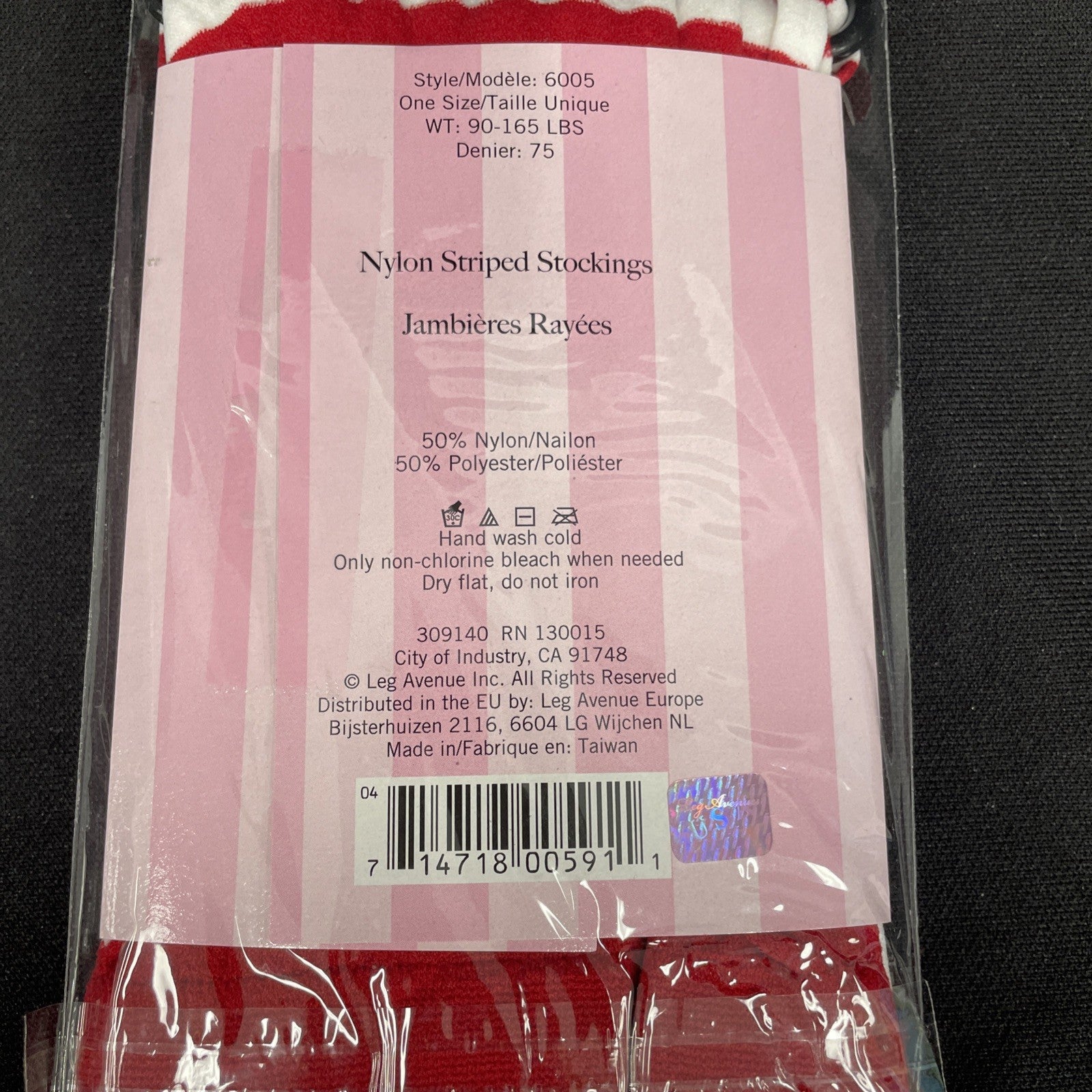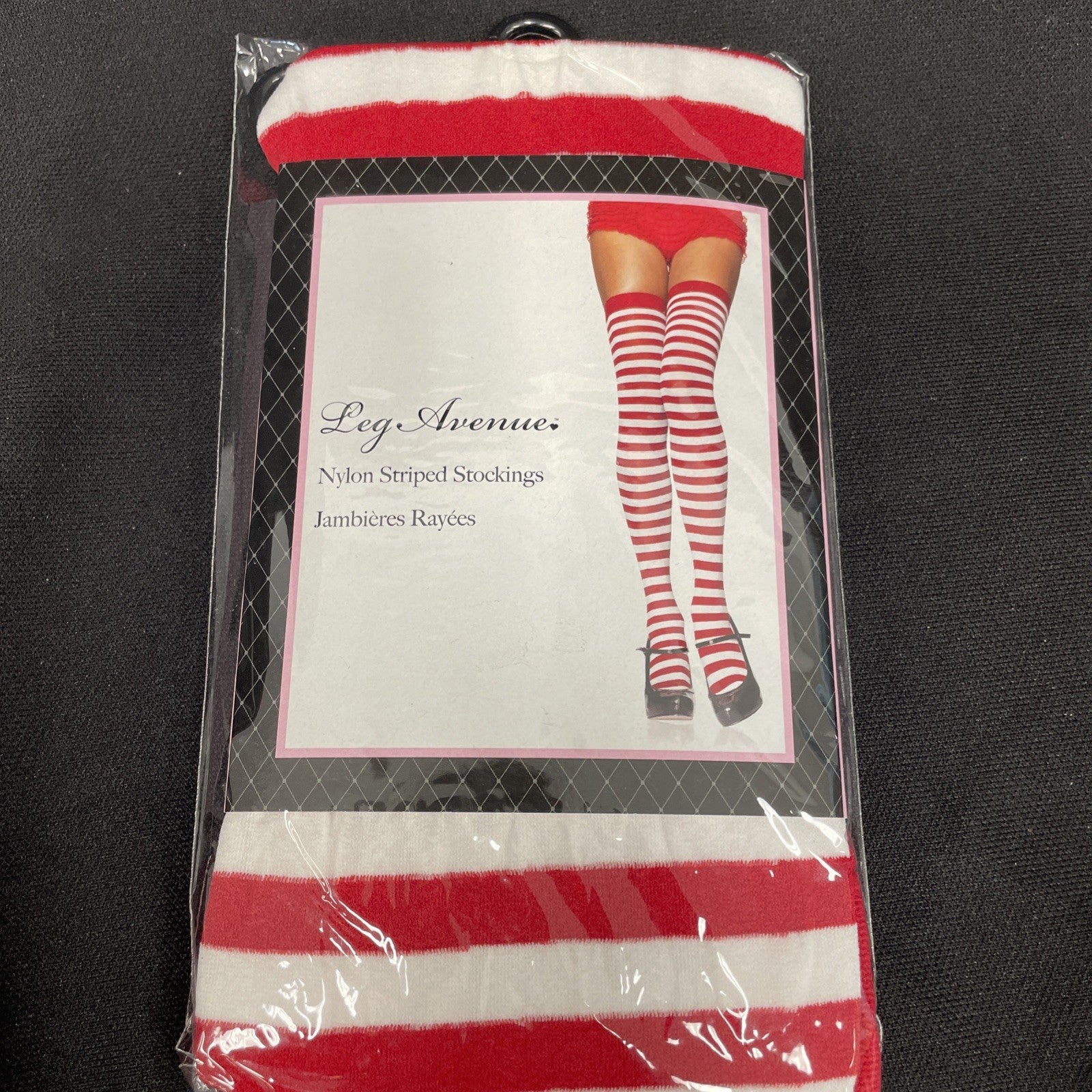 The product is a pair of thigh-high stockings from Leg Avenue, designed with a red and white striped pattern. These knee-high socks are a novelty item, perfect for adding a bold touch to any outfit. With a one-size-fits-all size, these stockings are a fun and eye-catching addition to any woman's wardrobe.